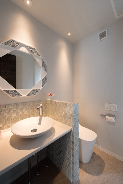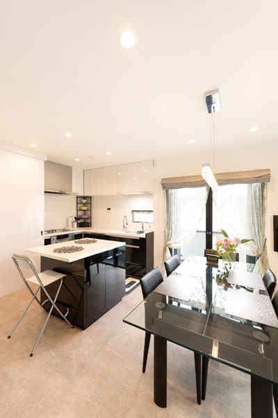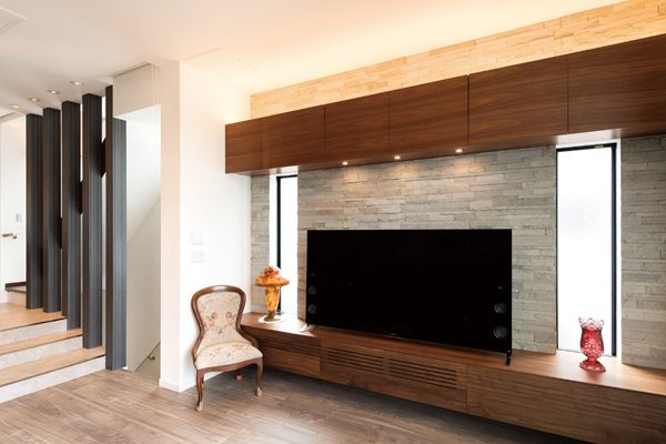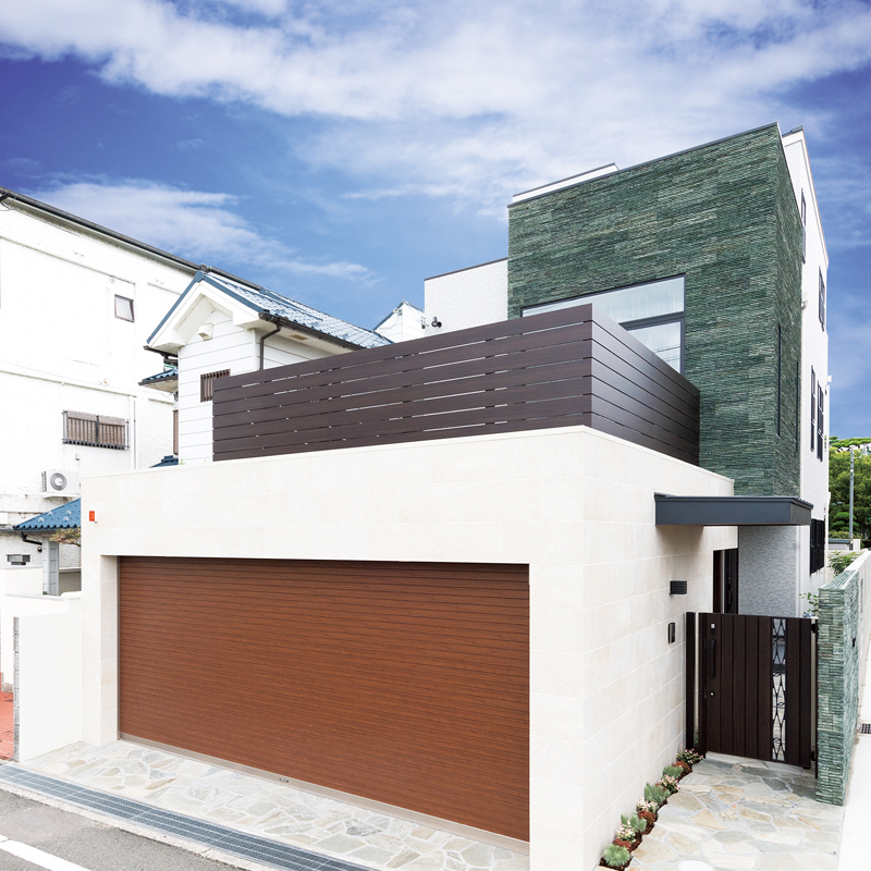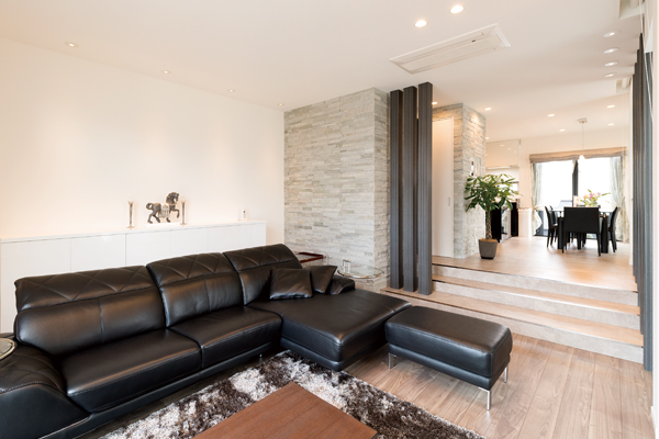 高級感のある石やタイルで仕上げた外観が目をひく邸宅。お施主様のこだわりと建築士の提案したアイデアが随所に活かされています。ダウンフロア設計でより天井を高く感じられるLDKは、川沿いというロケーションを生かし、心から寛げる広がりある空間に。リビングからフラットにつながるルーフバルコニーに出ると、川沿いならではの開放的な景色が広がります。