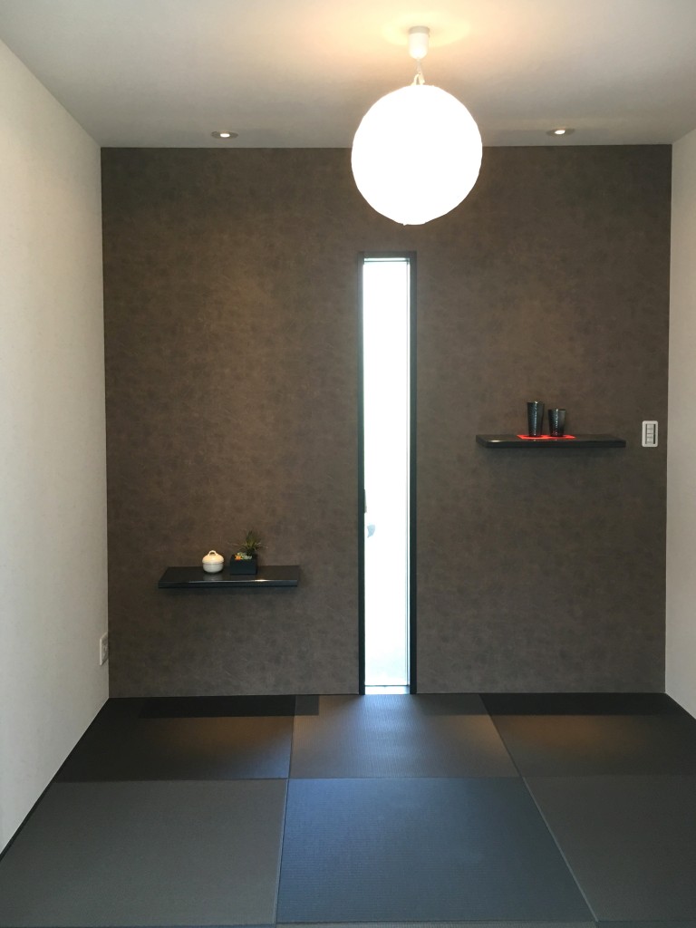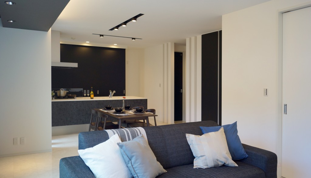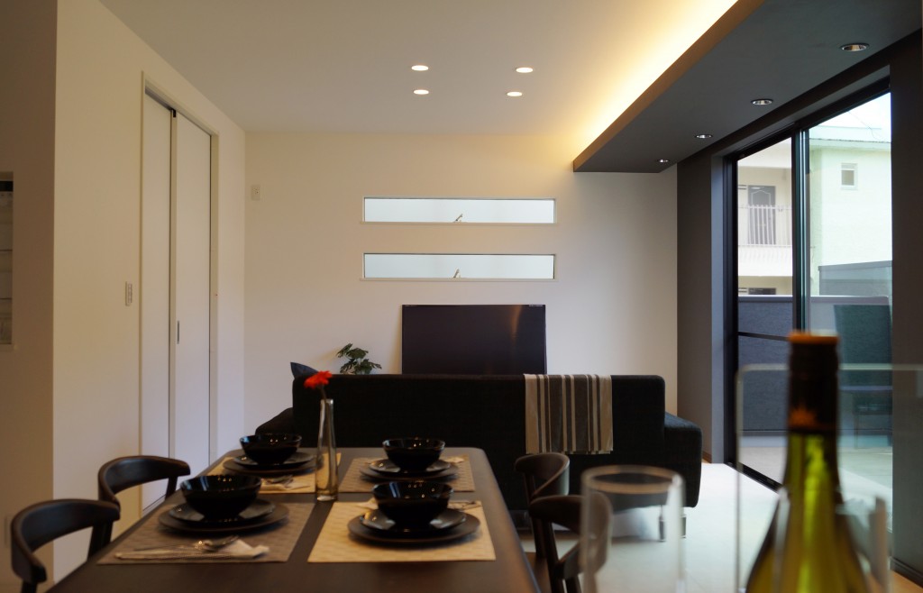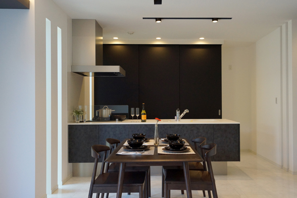 ファサードの真っ黒な壁が印象的な家。三角形の角地でのプランニングの為、プライバシーの確保が難しい場所でしたが、玄関の前に一枚壁を設けることで視線を遮る工夫が。この壁は夜になるとシンボルッリーを映し出すスクリーンの役割も。