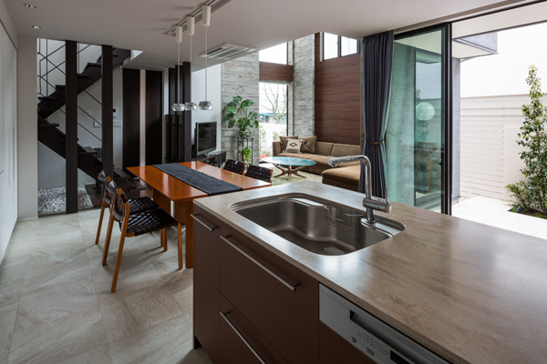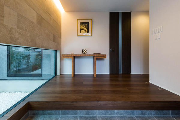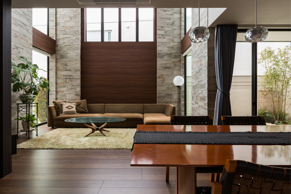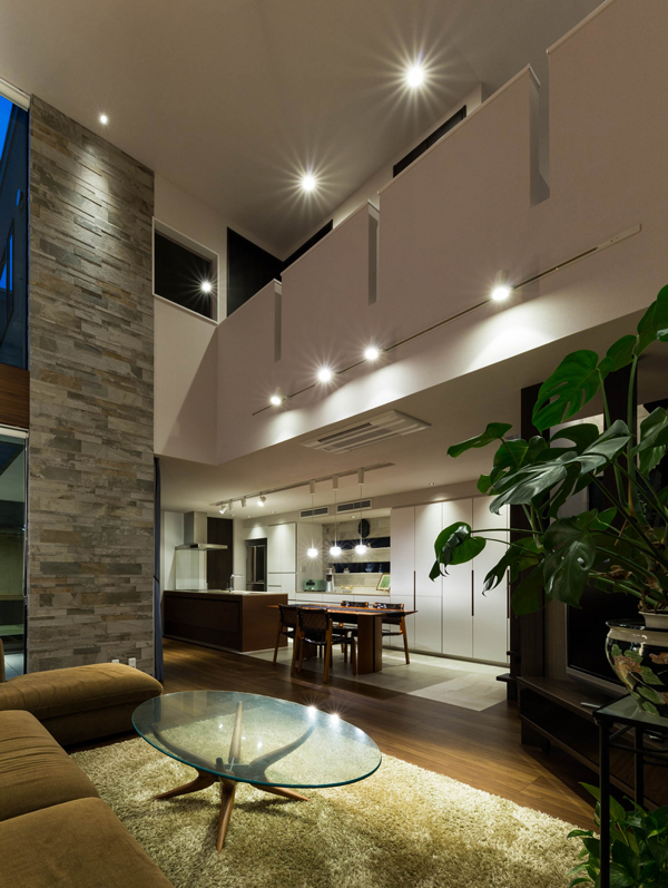 リビングに広がりが感じられるよう、吹き抜けに大きな開口を設け、ホテルのロビーのようなラグジュアリーなリビングをプランニング。打合せでくみ上げられた、お施主様のご要望に建築士の遊び心をプラスして圧巻の大空間をご提案しました。