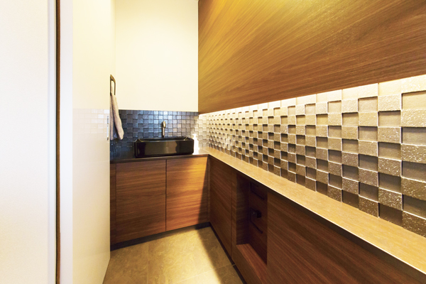 人通りの多い道路に面している立地条件。中庭を兼ねた玄関ポーチを格子で覆うことでプライバシーを確保しているので、リビングの窓を開けても安心。開放感のある家です。京都の料亭のような和モダンなテイストも散りばめて、ラグジュアリーに仕上げました。