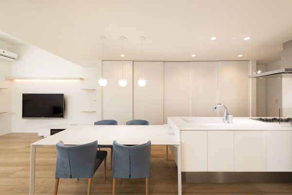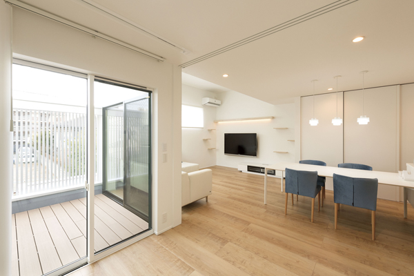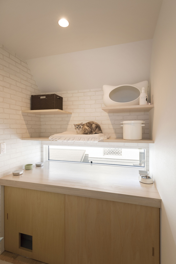 以前はマンションに住まれていた為、広い玄関と猫専用ルームが憧れだったと施主様。敷地に対して2階にLDKと水廻りを配置することで、広い玄関のスペースを確保。お子様が体を大きく動かして遊べるリビングにはキャットウォークも造作。外観は白で統一し、ブラックのサッシと木質感のあるドアでナチュラルテイストを。内装とインテリアはシャビー調でまとめたお施主様のセンスと建築士のアイデアが詰まった一邸です。