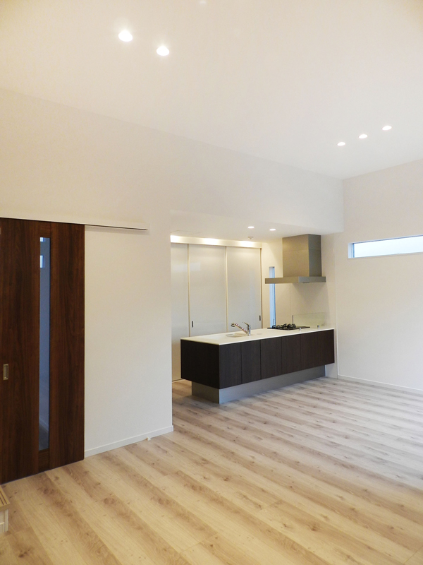 敷地の高低差を活かし建てられたプロジェクト。北側は天井高を高くとれない制限を受ける土地ではありましたが、プランニングにより、それを感じさせない仕上がりとなっています。シンプルがお好みのお施主様。内外装共に無駄なくすっきりと仕上げた中、唯一和室が遊び心ある空間となっています。