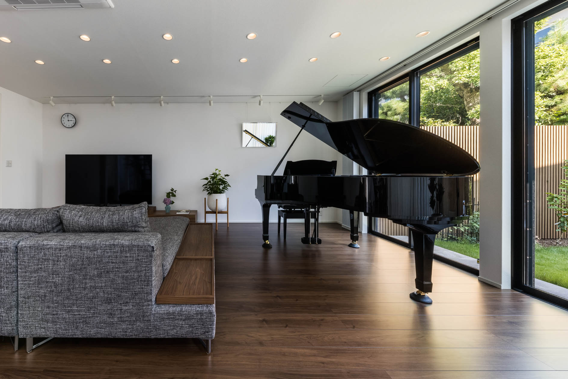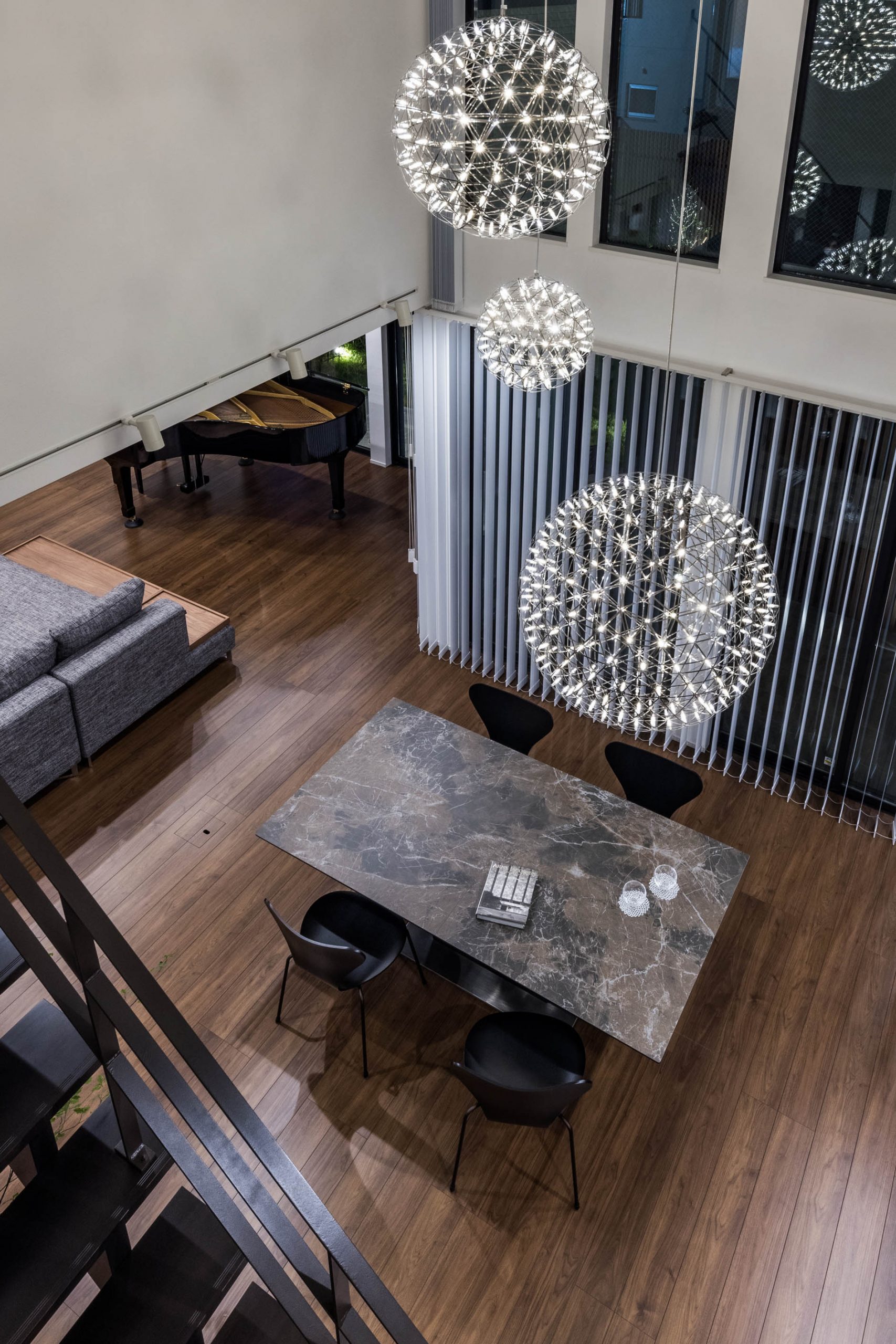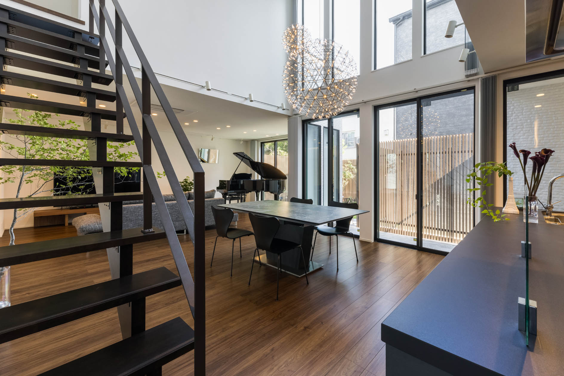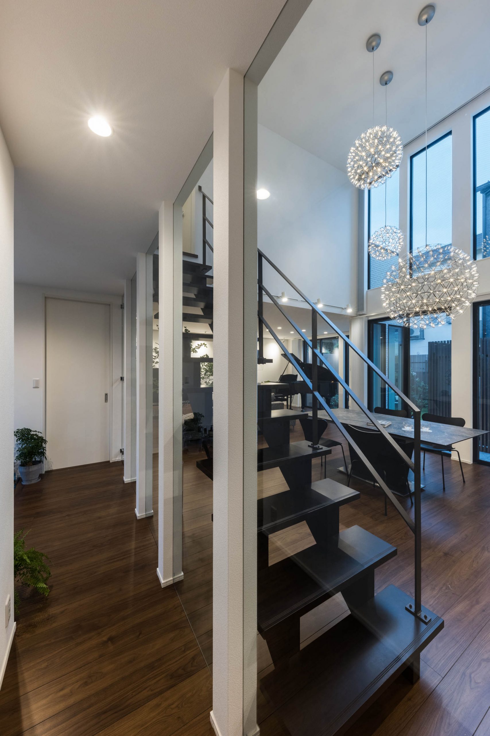 白い外壁メインでアクセントにグレーを使用した外観。白い外壁が汚れないようになるべく窓を設置しなくてもいいような間取りに。玄関とLDKの境界をガラスで間仕切ることによって、玄関の明るさを確保するとともに、抜け感・広がりも確保。加えて階段がアクセントとなり、余計なデザインを加えずとも、シンプルで洗練された空間に。LDKに入るとダイニングの吹き抜けにはお施主様こだわりのペンダントライトがお出迎え。また主役になるように配置を吟味したグランドピアノ。バーチカルブラインドの隙間から、まるで木漏れ日のような太陽光が降り注ぎ、素敵な演奏会を演出します。ダークにまとまった内装とアクセントのグレーのキッチンスペースと相まって、シックで落ち着きのある一邸に。