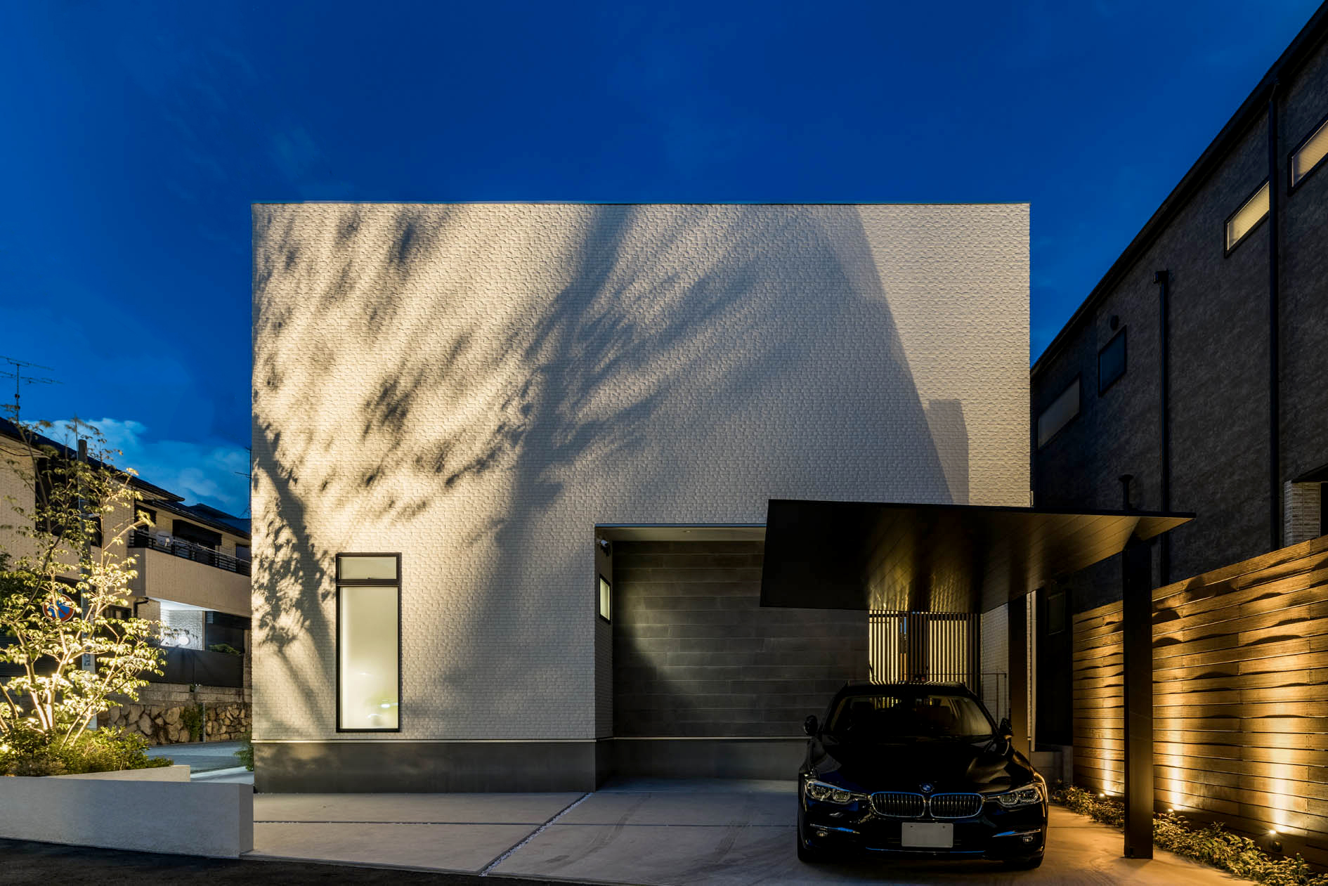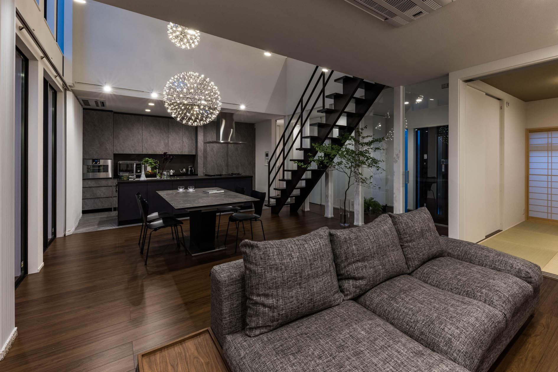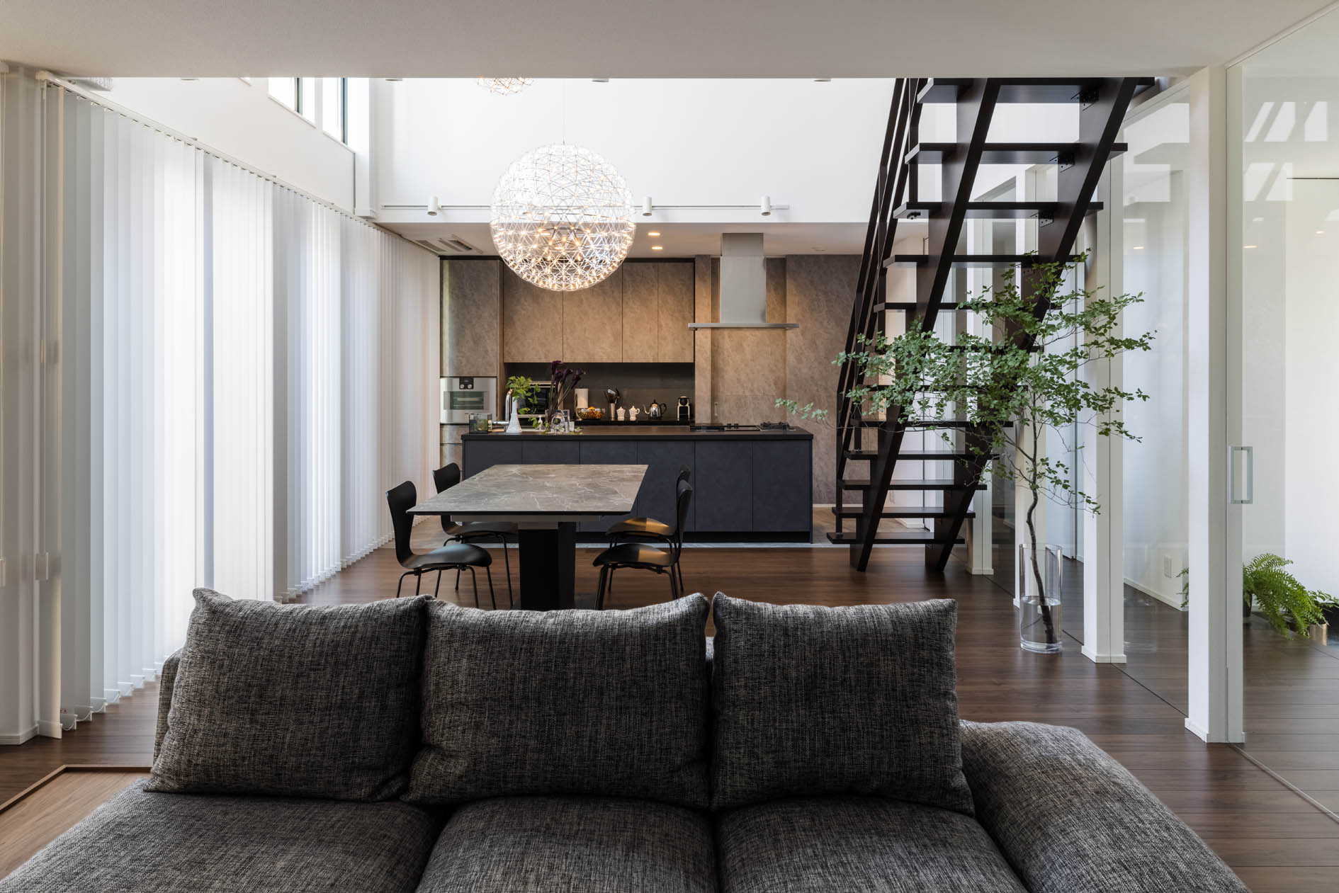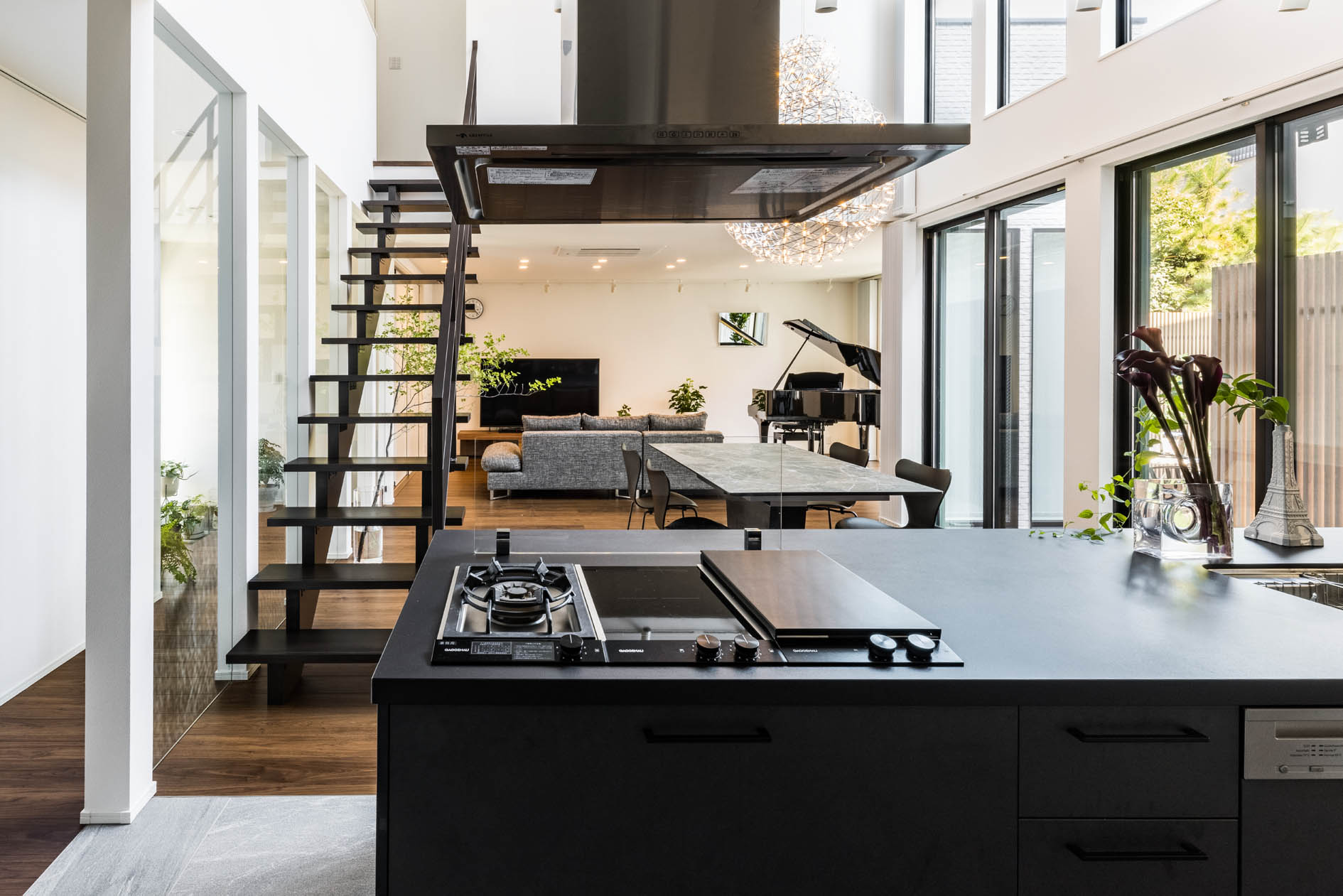 白い外壁メインでアクセントにグレーを使用した外観。白い外壁が汚れないようになるべく窓を設置しなくてもいいような間取りに。玄関とLDKの境界をガラスで間仕切ることによって、玄関の明るさを確保するとともに、抜け感・広がりも確保。加えて階段がアクセントとなり、余計なデザインを加えずとも、シンプルで洗練された空間に。LDKに入るとダイニングの吹き抜けにはお施主様こだわりのペンダントライトがお出迎え。また主役になるように配置を吟味したグランドピアノ。バーチカルブラインドの隙間から、まるで木漏れ日のような太陽光が降り注ぎ、素敵な演奏会を演出します。ダークにまとまった内装とアクセントのグレーのキッチンスペースと相まって、シックで落ち着きのある一邸に。