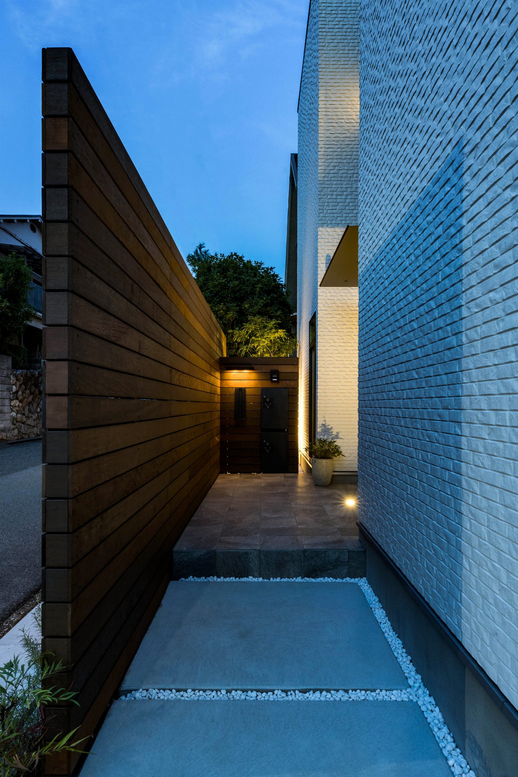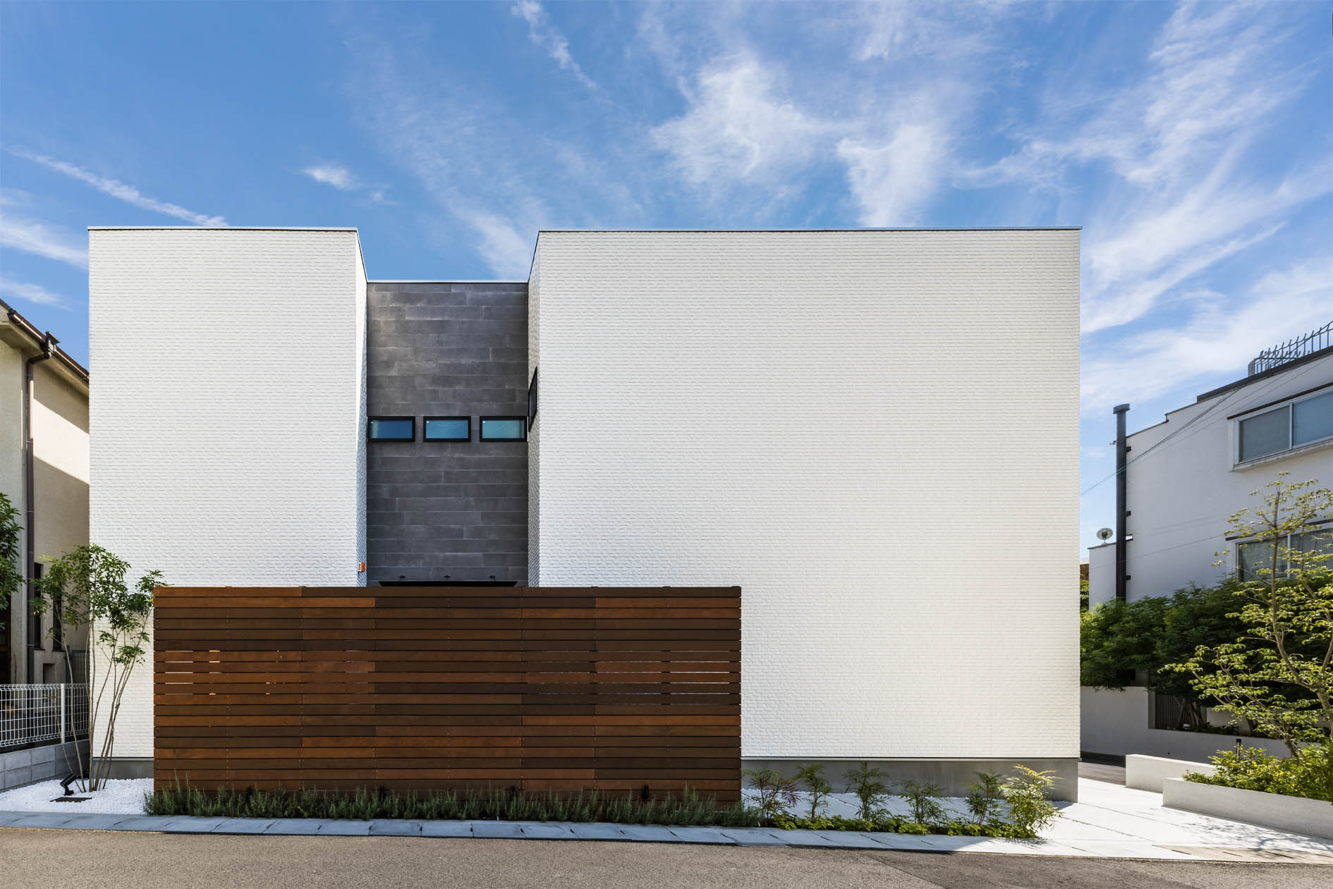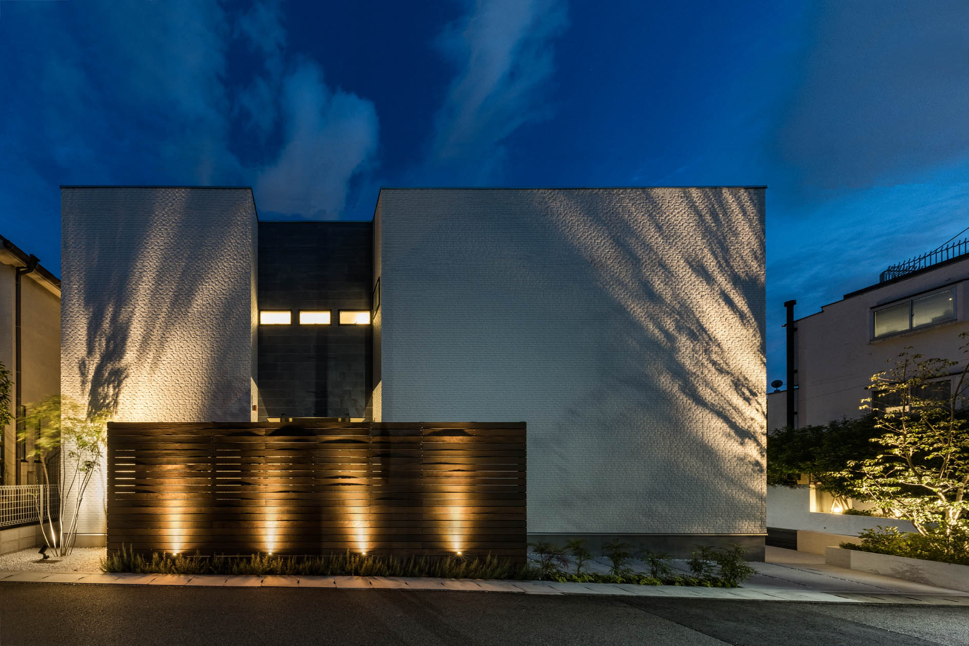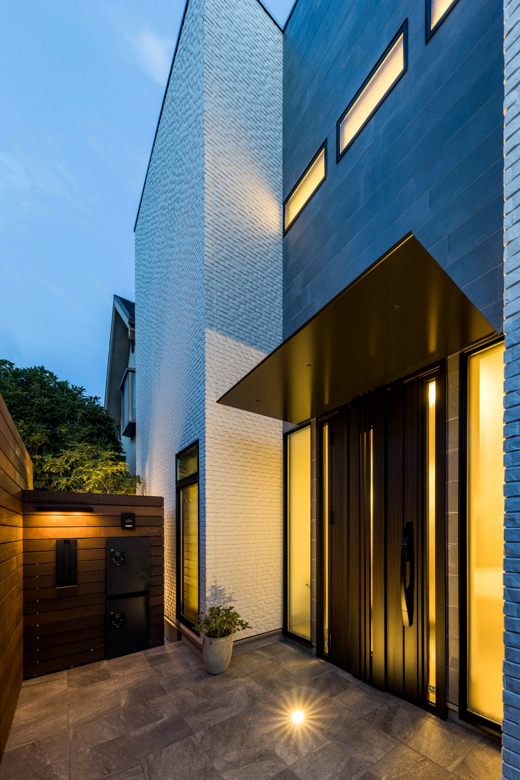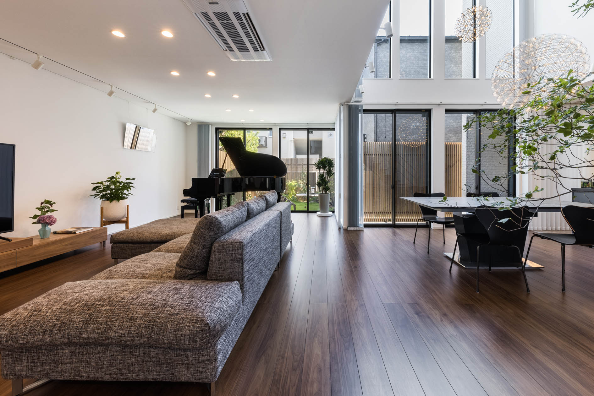 白い外壁メインでアクセントにグレーを使用した外観。白い外壁が汚れないようになるべく窓を設置しなくてもいいような間取りに。玄関とLDKの境界をガラスで間仕切ることによって、玄関の明るさを確保するとともに、抜け感・広がりも確保。加えて階段がアクセントとなり、余計なデザインを加えずとも、シンプルで洗練された空間に。LDKに入るとダイニングの吹き抜けにはお施主様こだわりのペンダントライトがお出迎え。また主役になるように配置を吟味したグランドピアノ。バーチカルブラインドの隙間から、まるで木漏れ日のような太陽光が降り注ぎ、素敵な演奏会を演出します。ダークにまとまった内装とアクセントのグレーのキッチンスペースと相まって、シックで落ち着きのある一邸に。