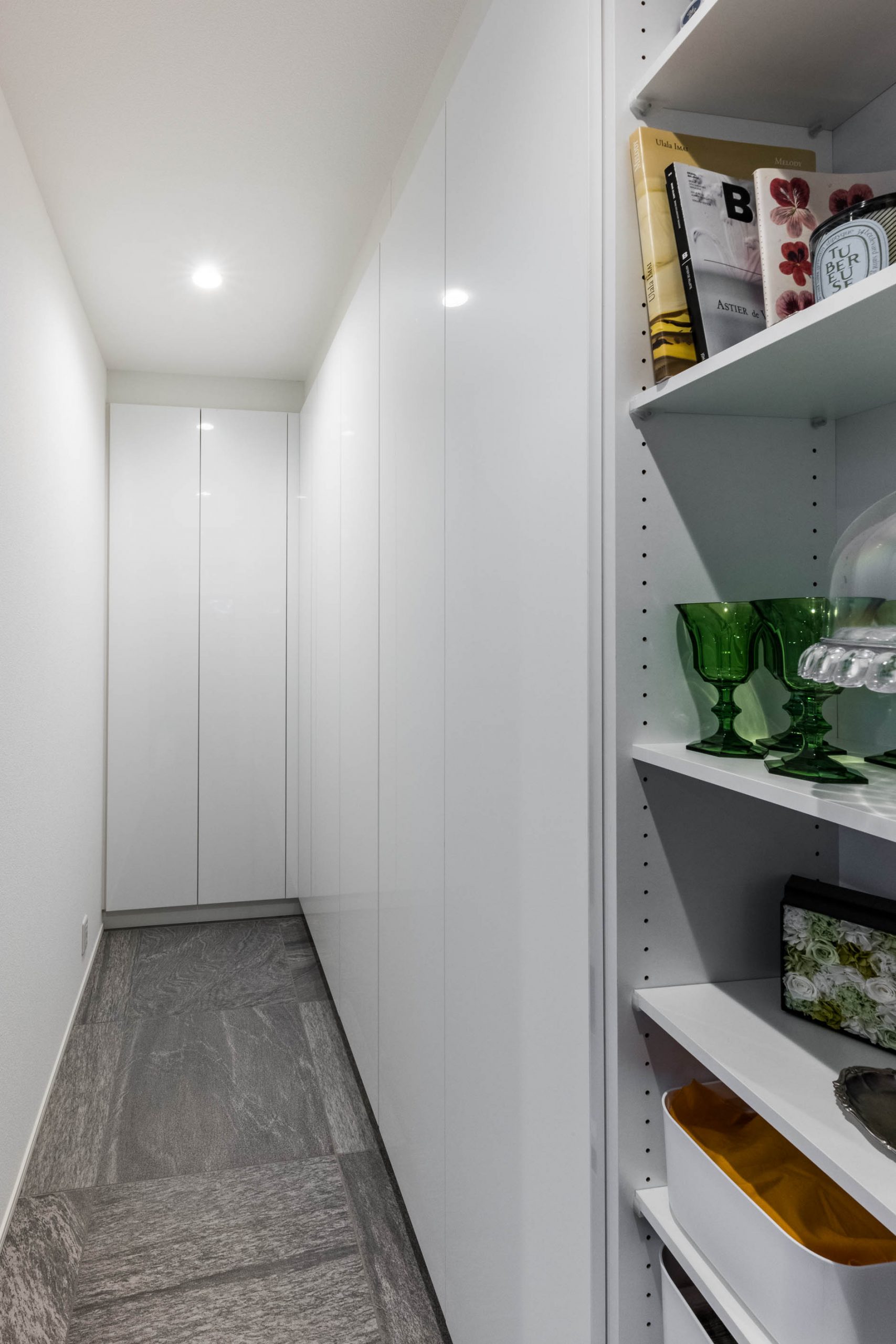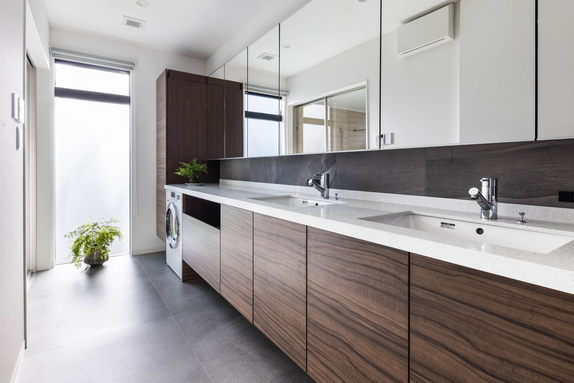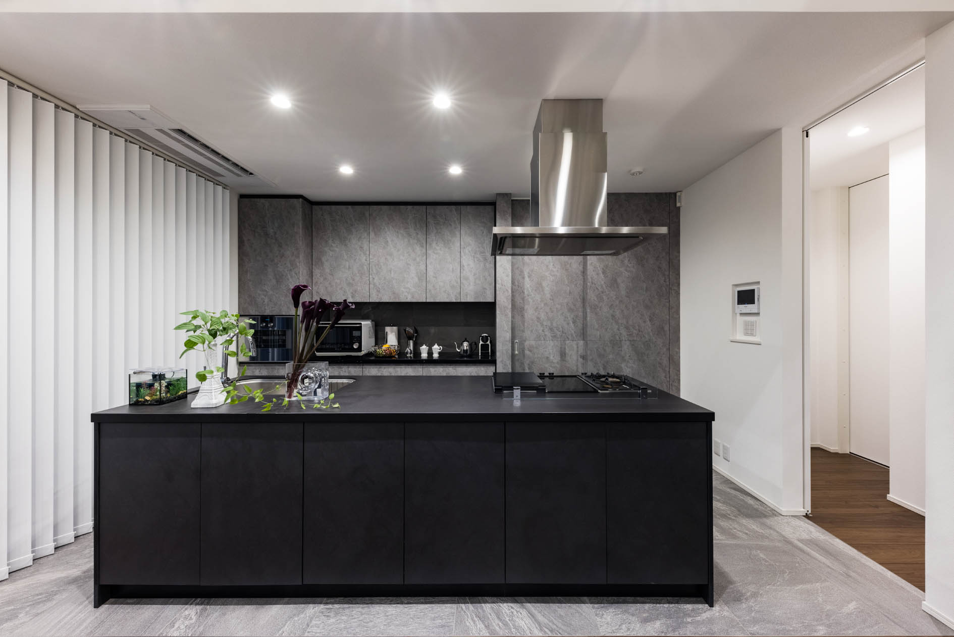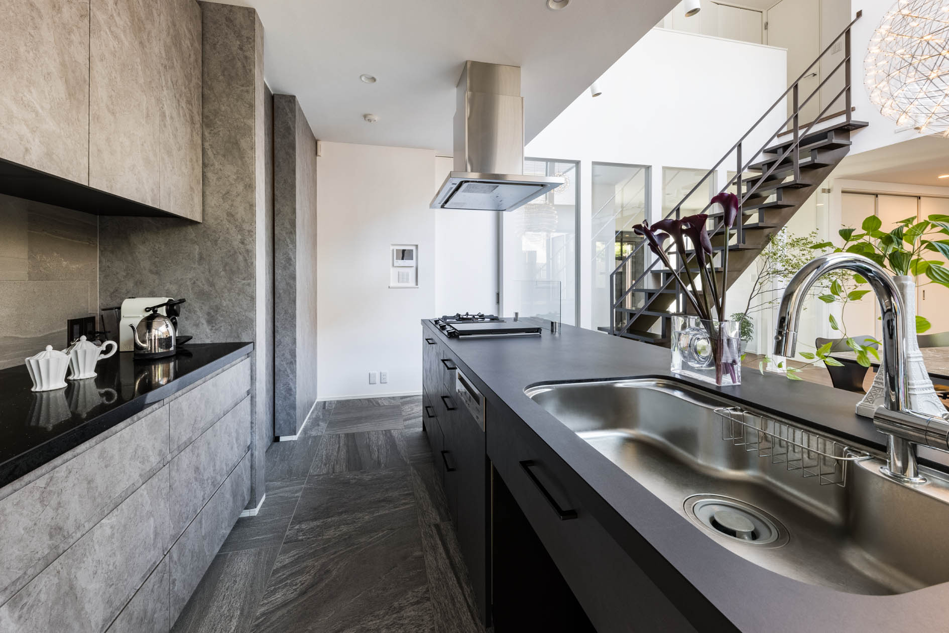 白い外壁メインでアクセントにグレーを使用した外観。白い外壁が汚れないようになるべく窓を設置しなくてもいいような間取りに。玄関とLDKの境界をガラスで間仕切ることによって、玄関の明るさを確保するとともに、抜け感・広がりも確保。加えて階段がアクセントとなり、余計なデザインを加えずとも、シンプルで洗練された空間に。LDKに入るとダイニングの吹き抜けにはお施主様こだわりのペンダントライトがお出迎え。また主役になるように配置を吟味したグランドピアノ。バーチカルブラインドの隙間から、まるで木漏れ日のような太陽光が降り注ぎ、素敵な演奏会を演出します。ダークにまとまった内装とアクセントのグレーのキッチンスペースと相まって、シックで落ち着きのある一邸に。