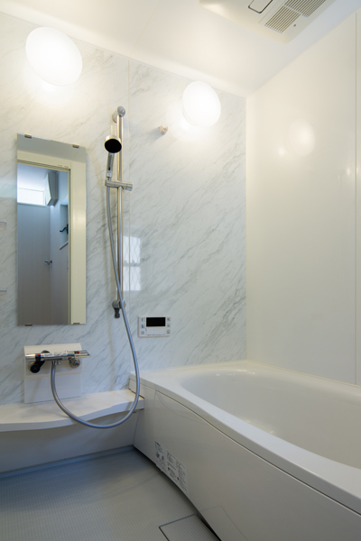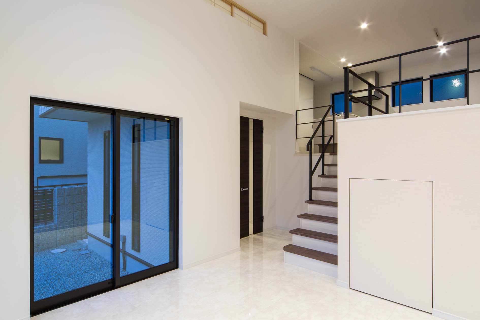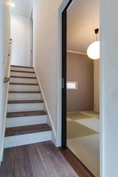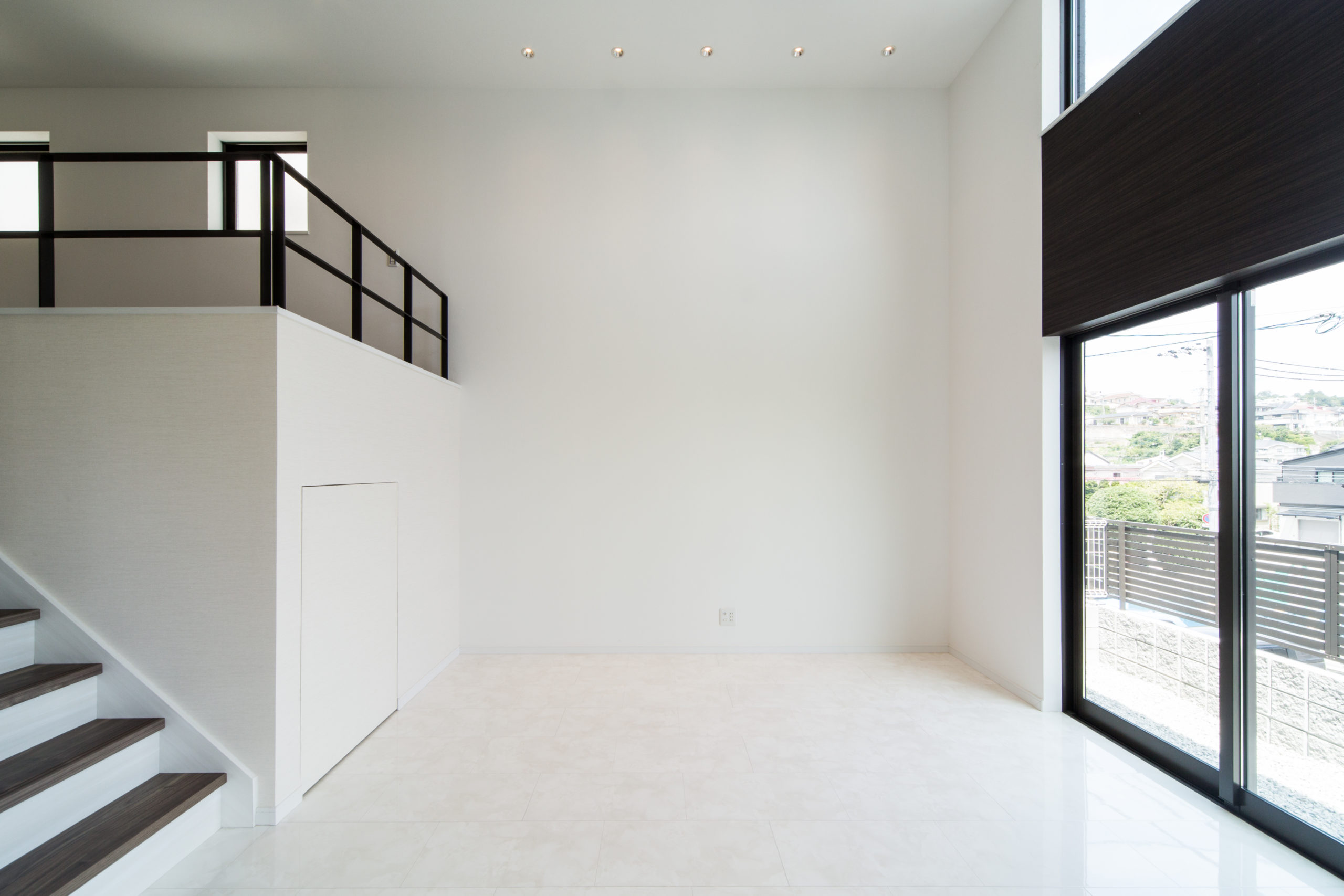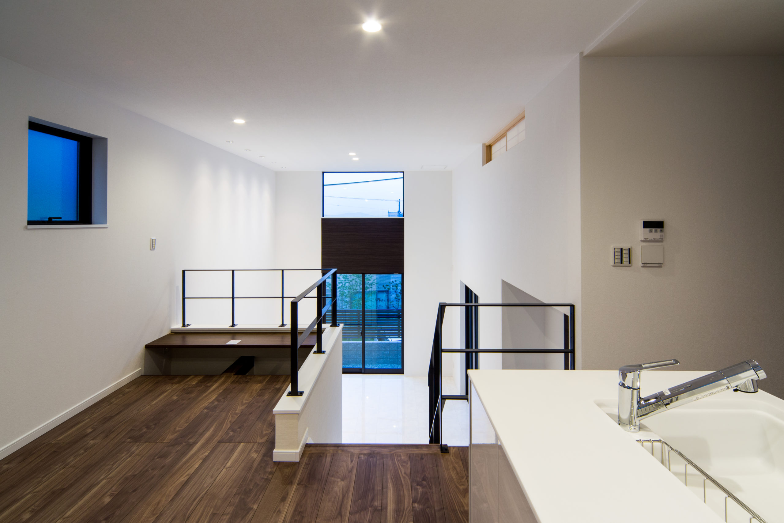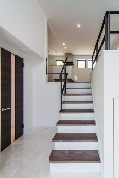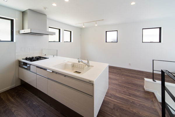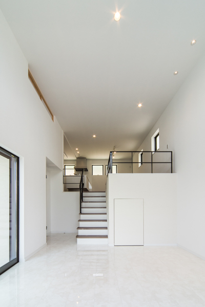見上げたり、見下ろしたり…。フラットになりがちな普段の生活の中に、様々なシーンが生まれるのが¨スキップフロア¨のいい所。どこにいても家族との繋がりを感じられる空間をデザインしました。清潔感のあるホワイトのフロアと、高い位置に設けた窓からは惜しみなく太陽の光が降り注ぎ、明るい室内を演出します。