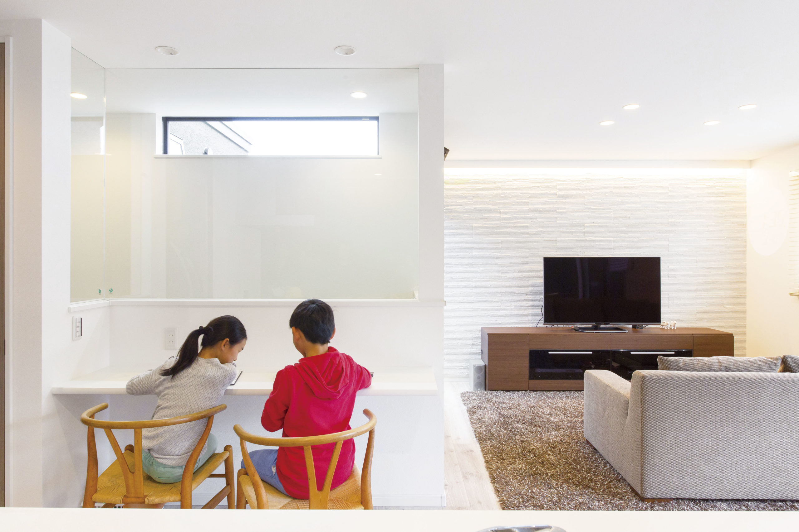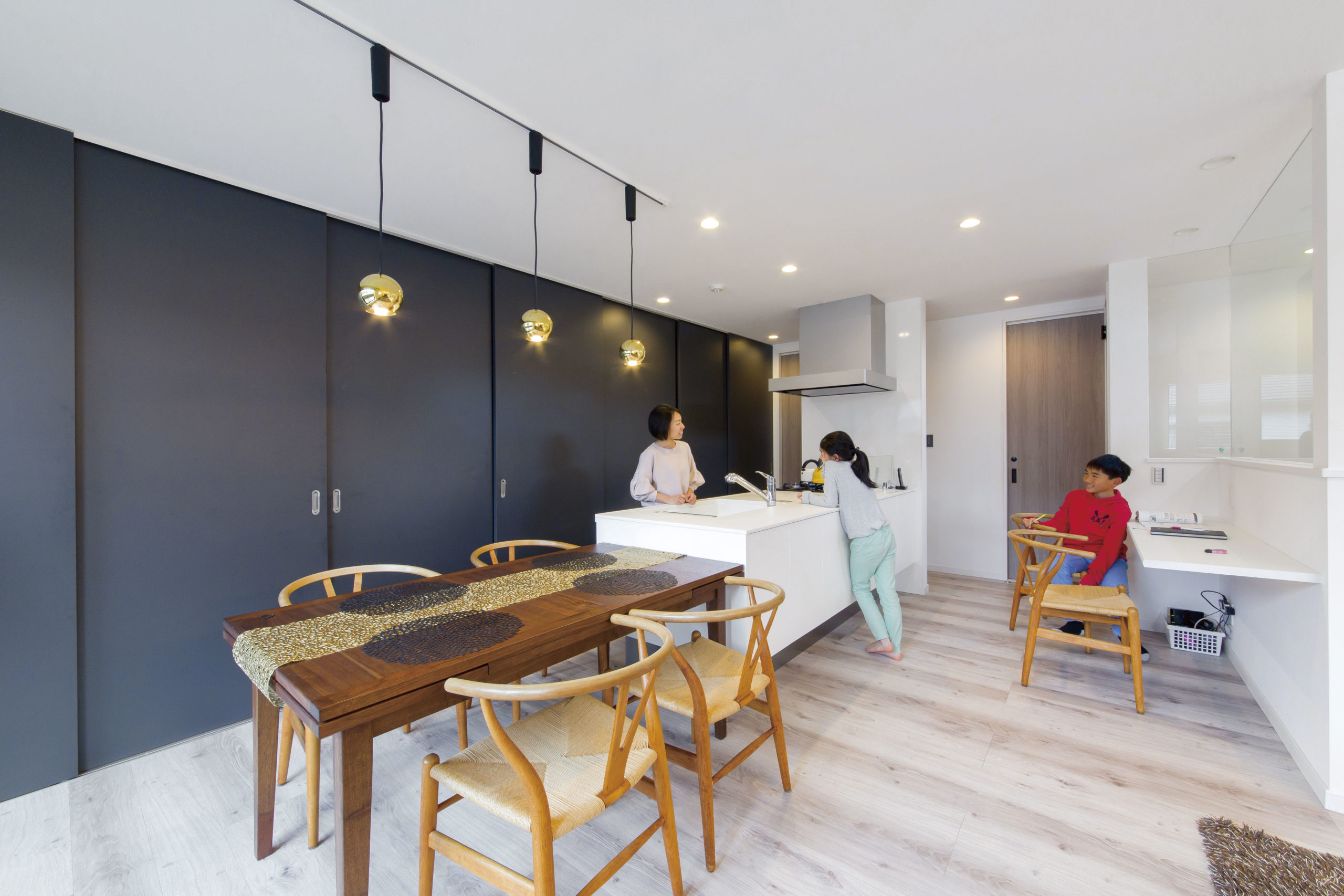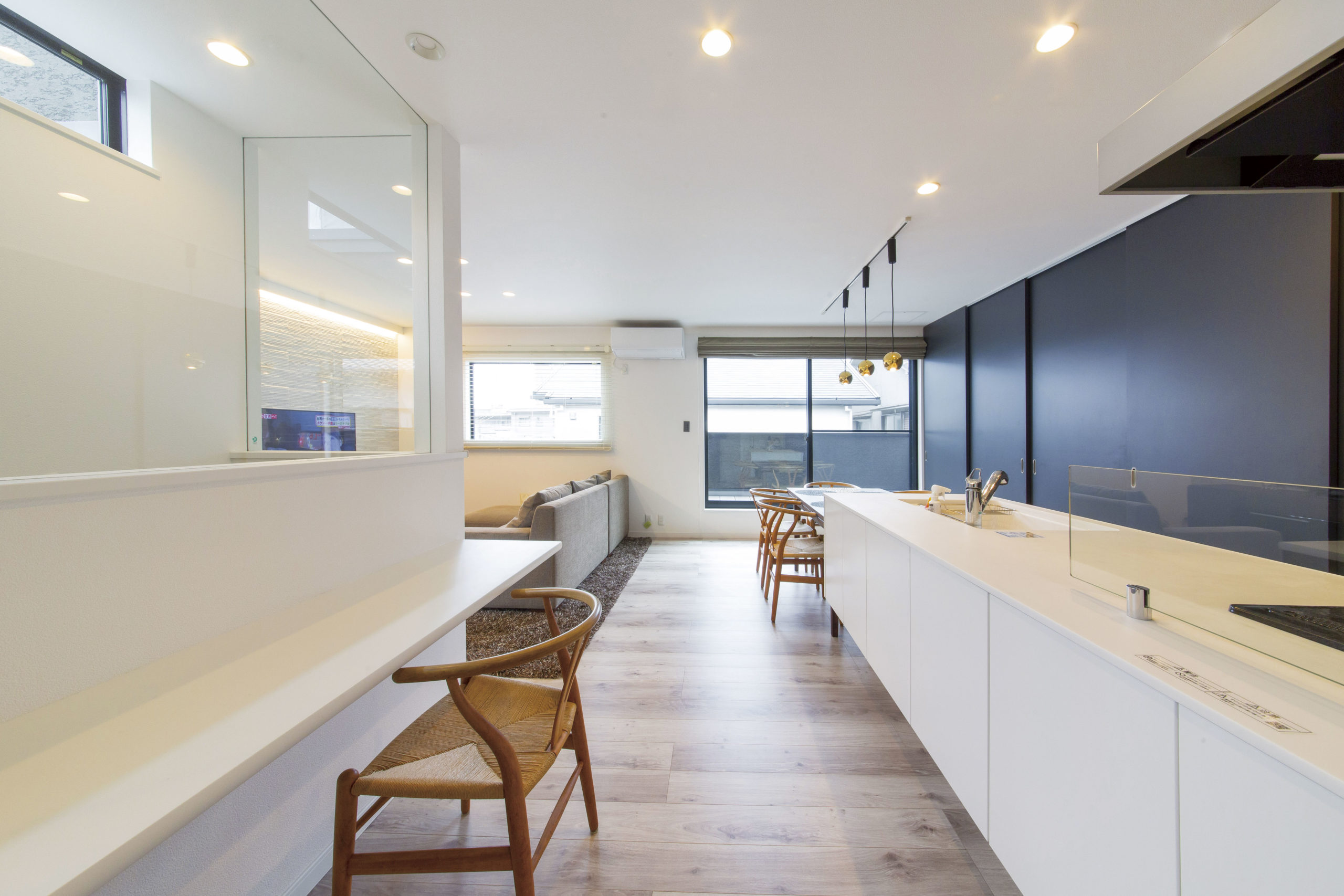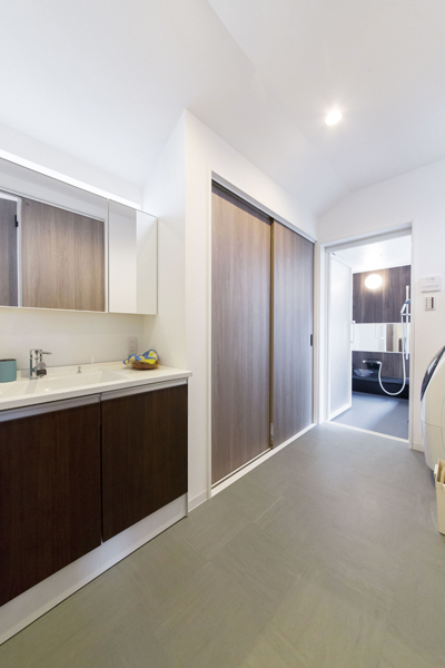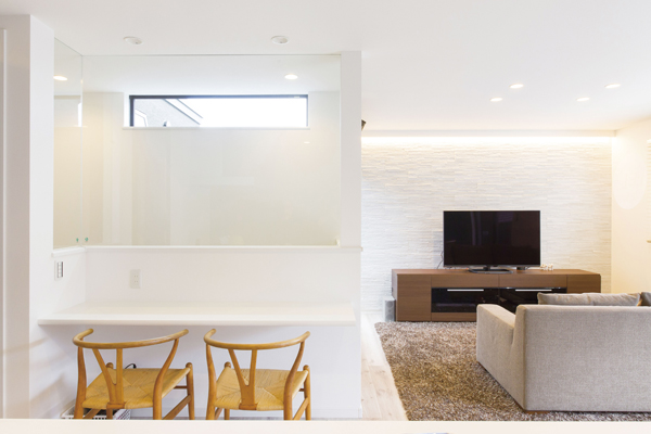 2つのバルコニーの中央に2階リビングを設け、角地のような開放感を満喫できる間取りに。また、アイランドキッチンを中心に、水回りやリビングを回遊できるように計画し、家族とのコミュニケーションの場を設けた。