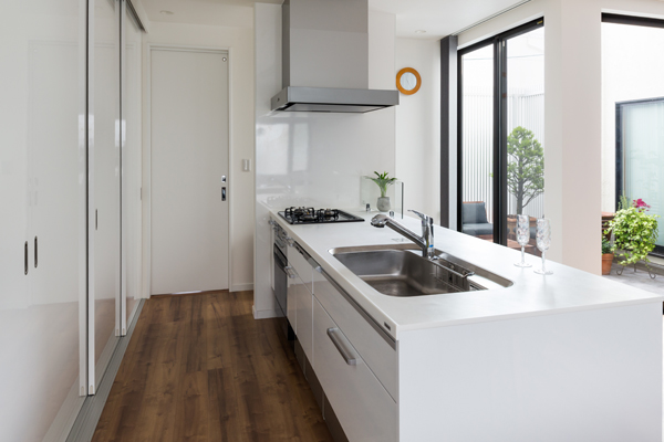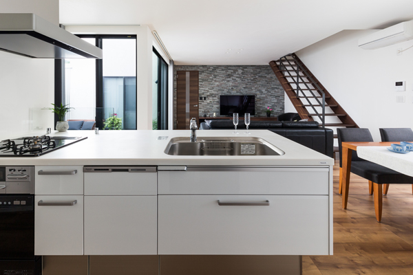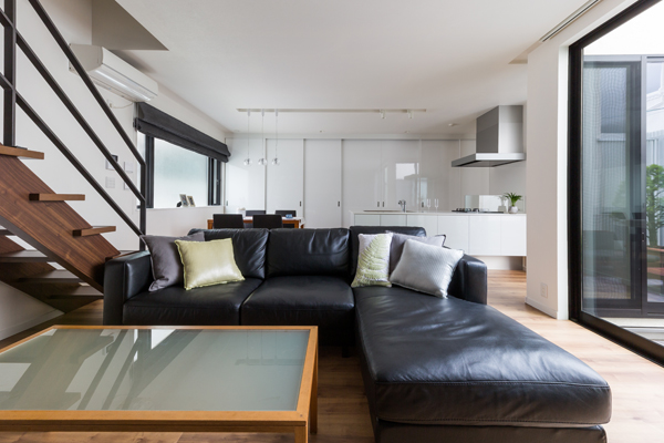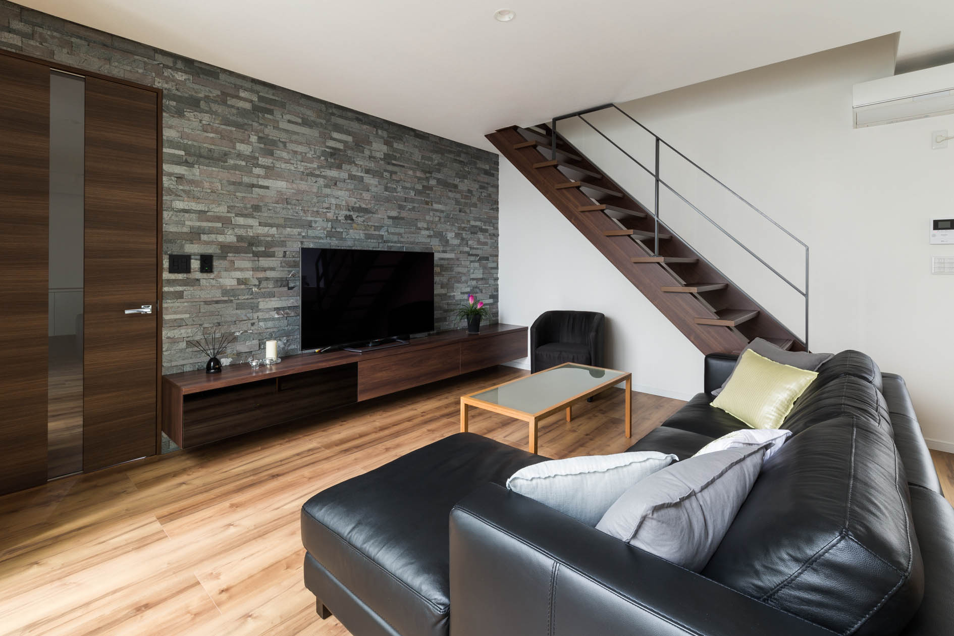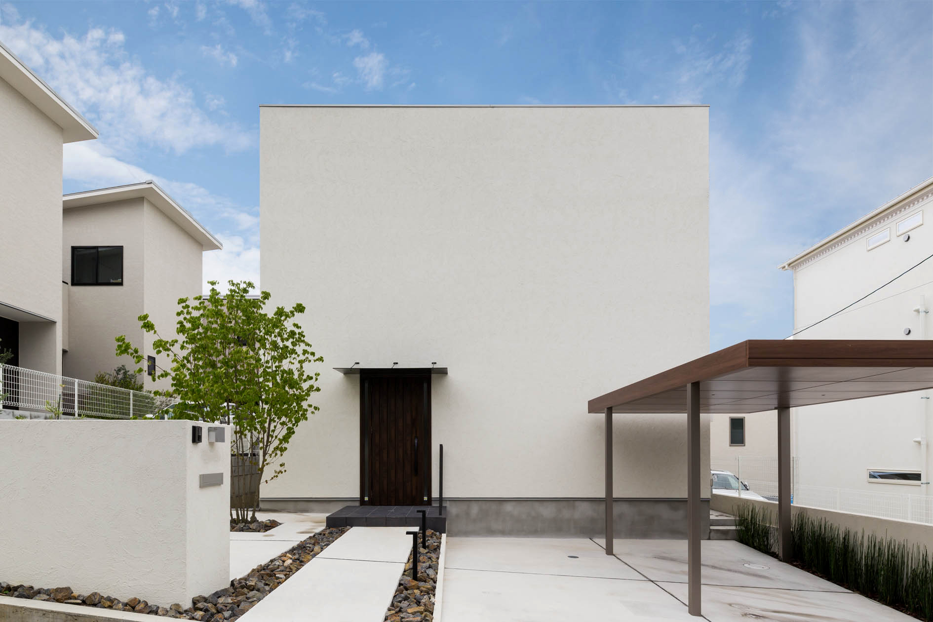 余計なデザインを一切排除させた、玄関のみのシンプルなファサードには、ライトアップされたシンボルツリーの影を愉しむ、印象的な外観にする為の計算されたデザイン。室内には、リビング内階段を採用し、家族とのコミュニケーションの場を大切にした、光と風が通る開放的な間取りに。