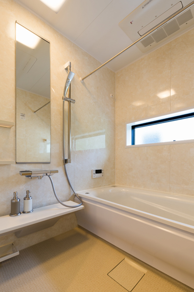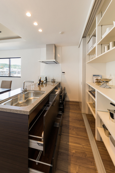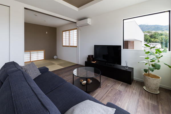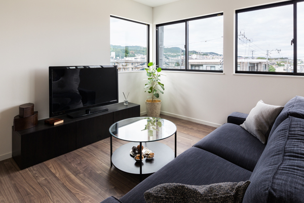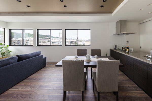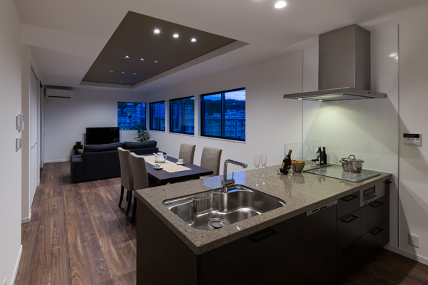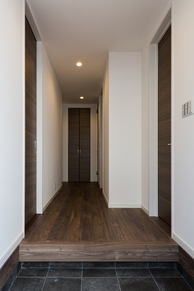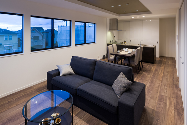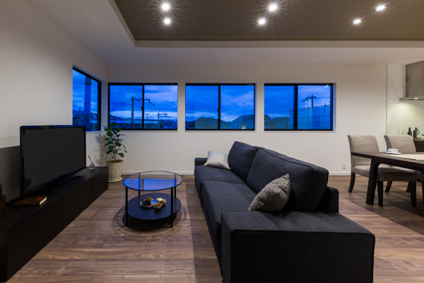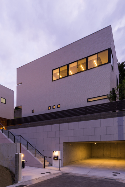 シンプルな箱形の建物とバランスのとれた、ボックスガレージが1つのデザインとして組み入れられた、スタイリッシュな全景。ボックスガレージになっていることで敷地が有効に使えるため、階段の先には、シンボルツリーが迎え入れてくれる、ゆとりのあるアプローチが広がっています。建物の凹凸が少ない為、内部にも無駄なスペースが無くたっぷりと収納もある贅沢な間取りになっています。