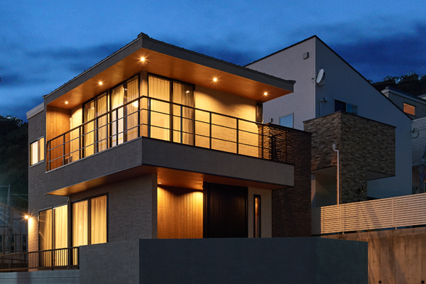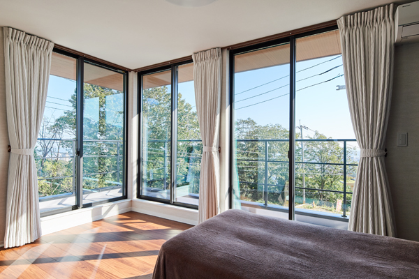隣地との高低差をうまく利用し、バルコニーの手すりをフレームのみにすることで、眺望が遮られず、主寝室からも神戸の夜景を眺めることが出来る。