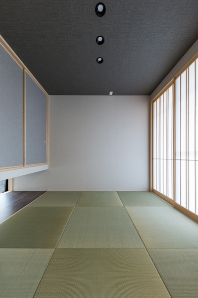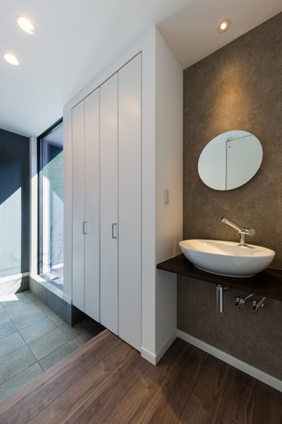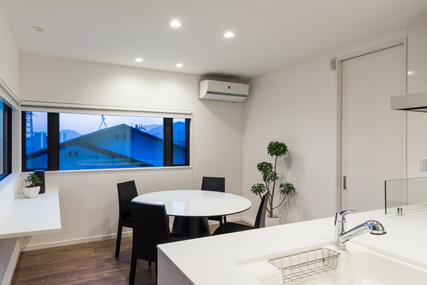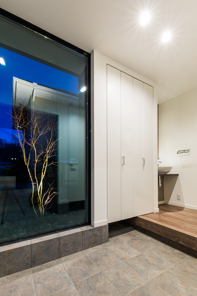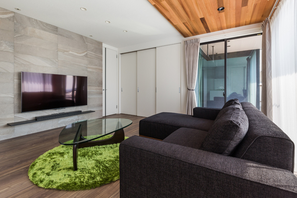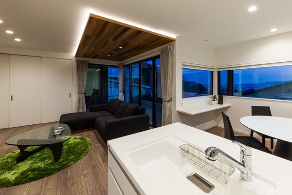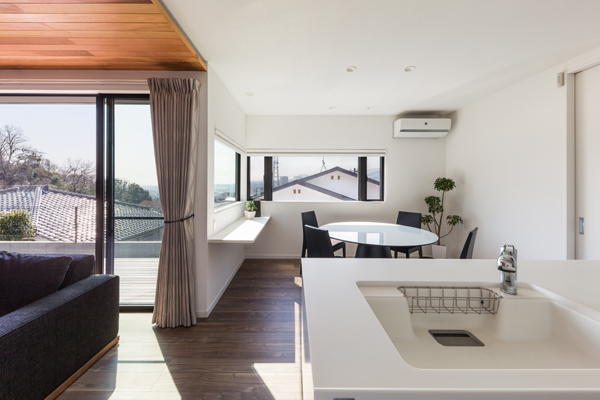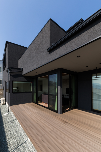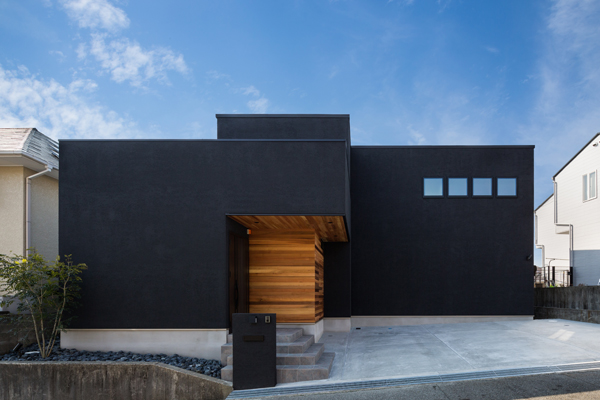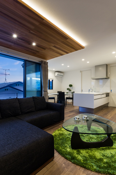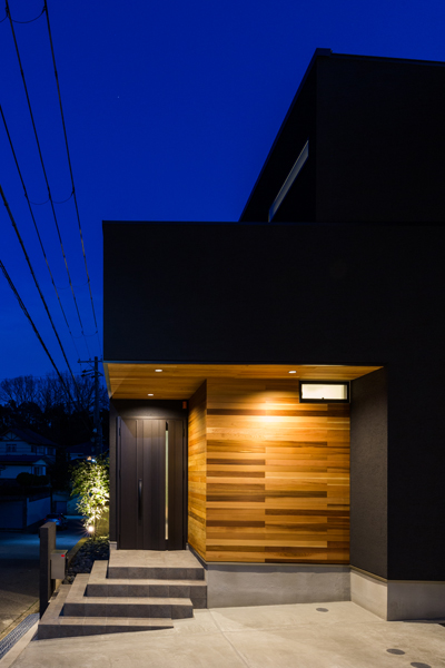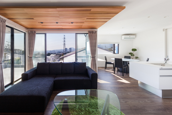 広い間口の敷地をうまく利用し、いくつもの長方形がバランスよく組み合わせたデザインに、レッドシダーを加える事でより立体的でシャープな印象をプラス。LDKからの眺望にも恵まれ、自然と家族が集まってくる空間づくりに設計士のこだわりがうかがえる。
