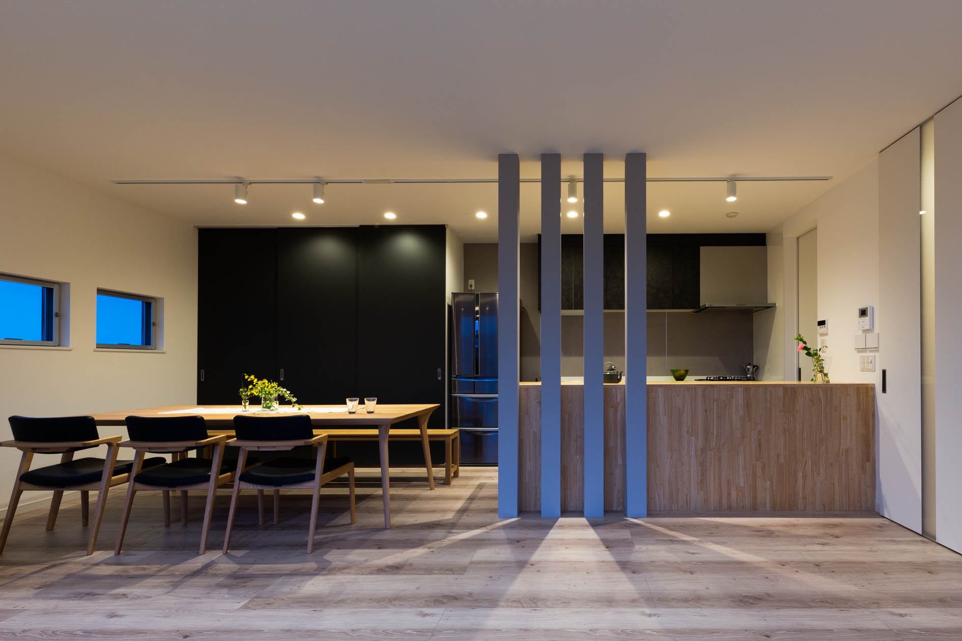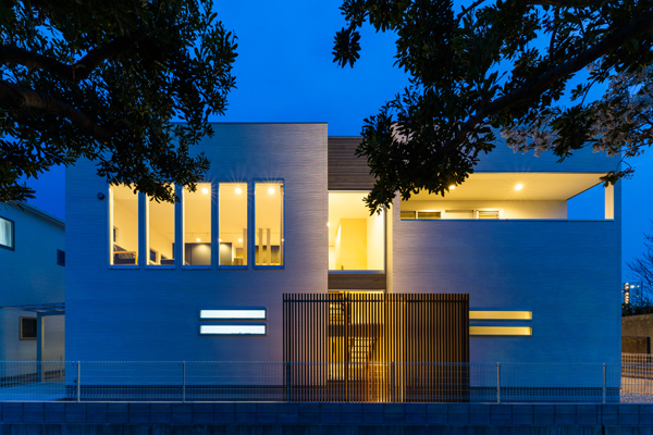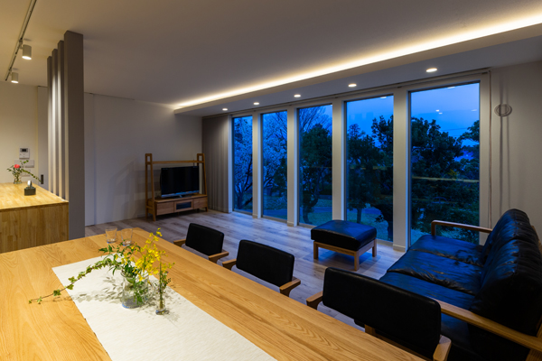 大胆に開放された窓からは、公園の借景を取り込み、プライバシーを確保するため、視線のレベルが交差しないようLDKは2階に設置する事をご提案しました。リビングには間接照明を設け、水平ラインを強調したデザインは、公園の広がりをより感じられる空間へ。