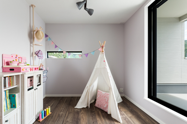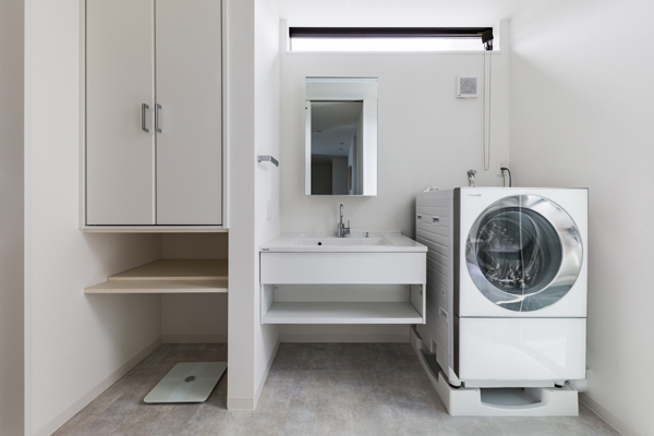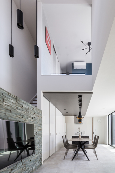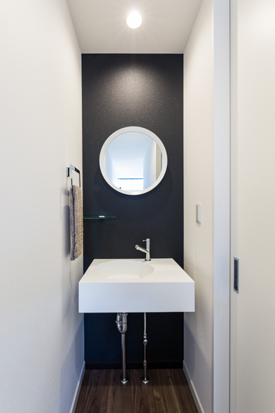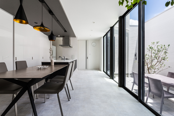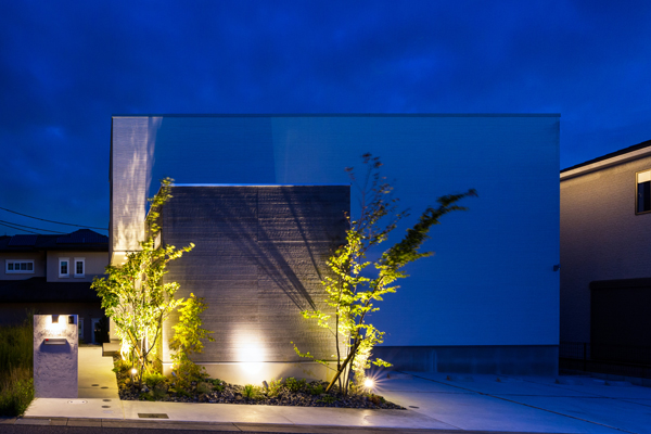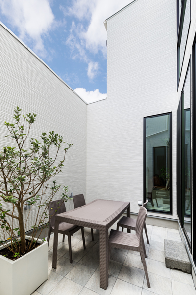 住宅街でありながら、開放的な空間と、周囲からのプライバシーが確保された、中庭プラン。自然が多い立地を活かし、吹抜けや大きな窓からの光や風が導かれ、一日を通し、きもちの良い日常を過ごせる様に計算された間取り。広い間口を利用し、ボックスが重なり合ってできたような立体感のある外観には、植栽が映えるようにファサードを重視した設計士の拘りも。