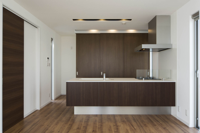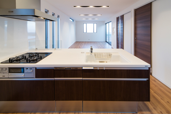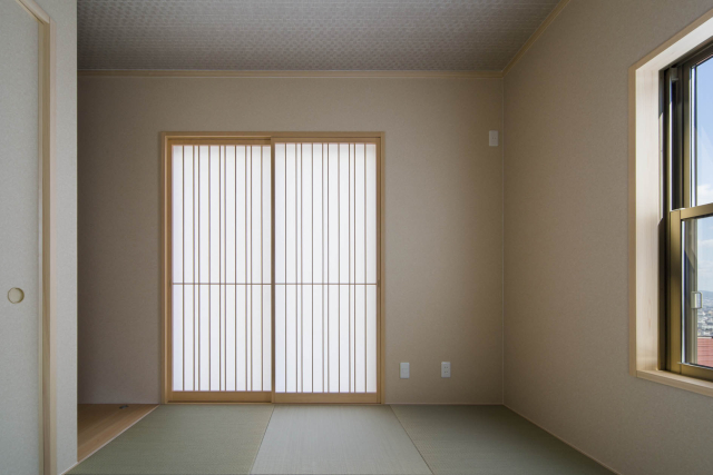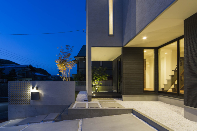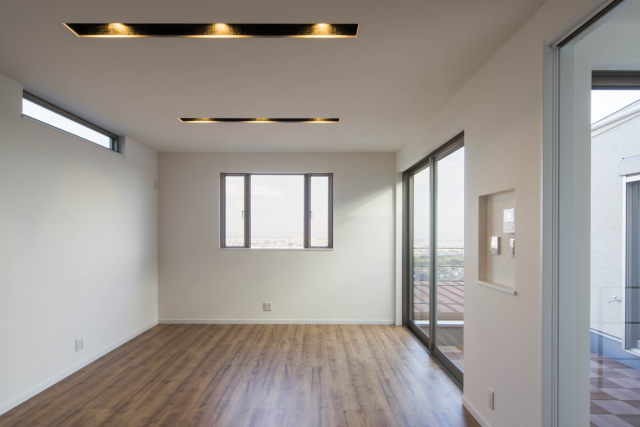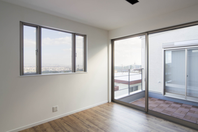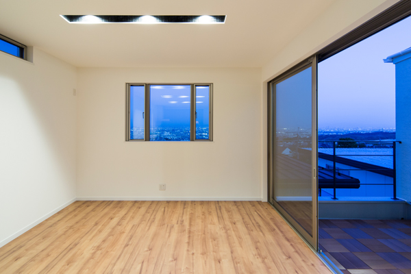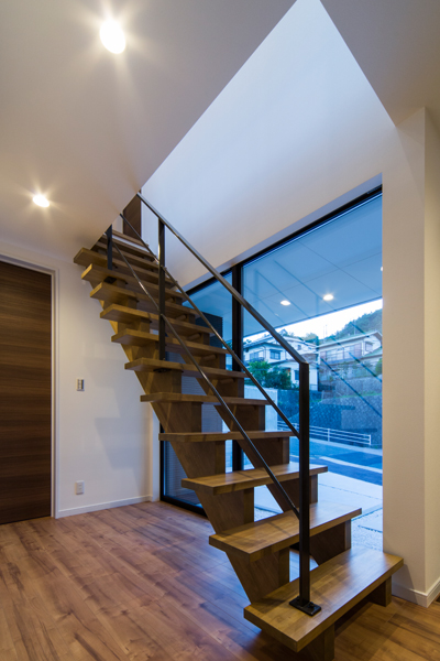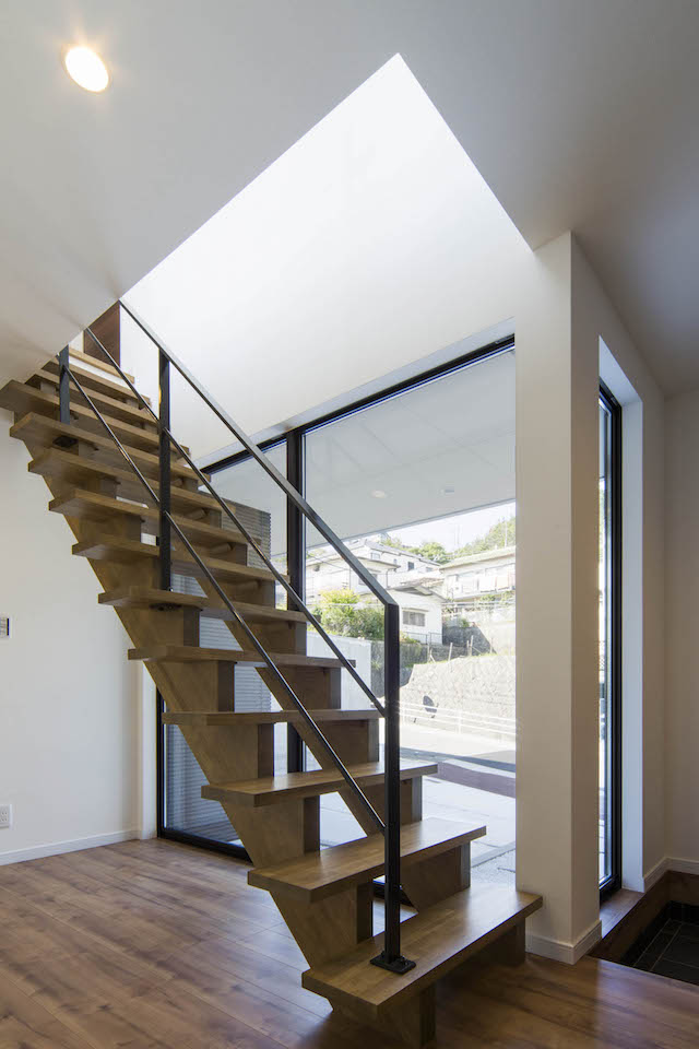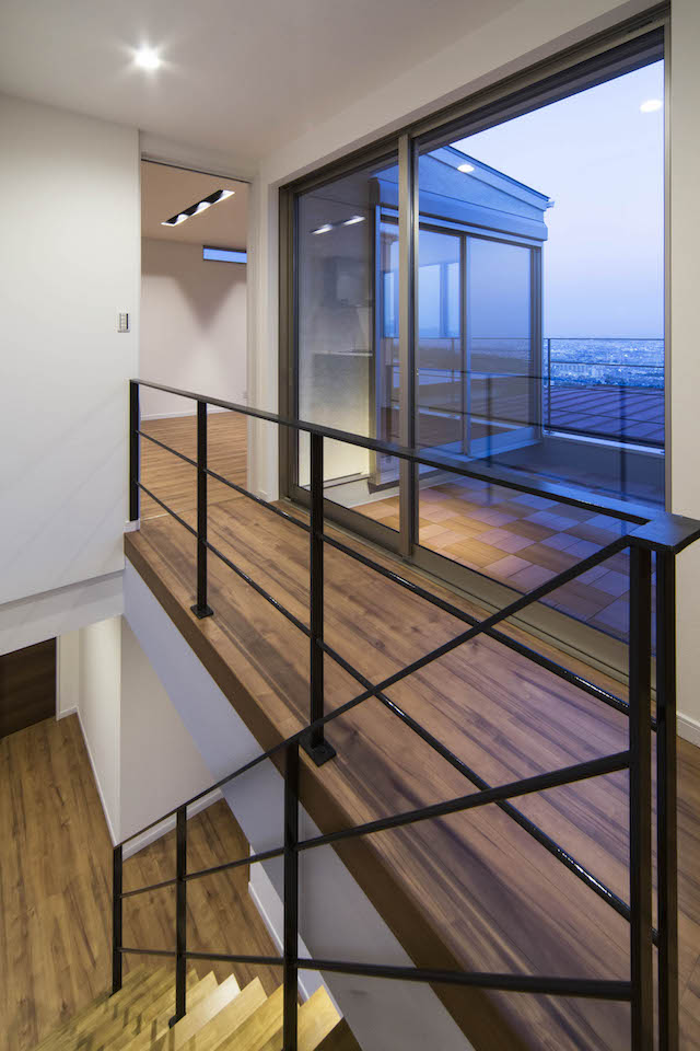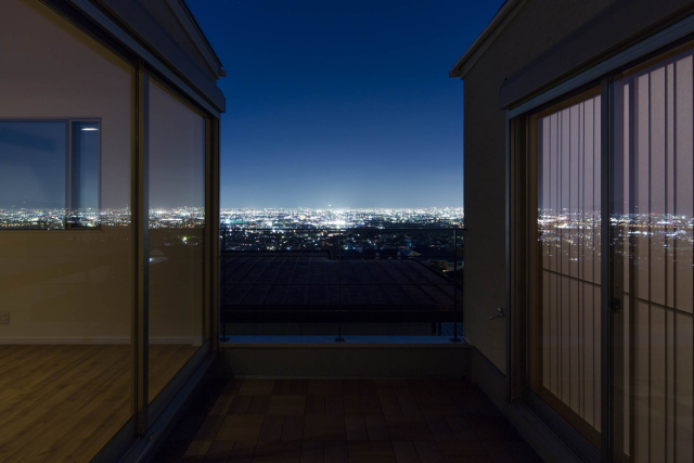 高台にあるこの土地の才能は眺望でした。景色の抜けを意識し、2階にLDKを配置し目線を高くすることで借景が楽しめる間取りを実現しました。また、中庭が回りからの視界を遮ることでプライバシーにも配慮。周りの目を気にすることなくこの景観を楽しんで頂けます。