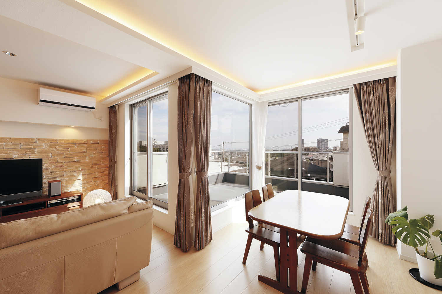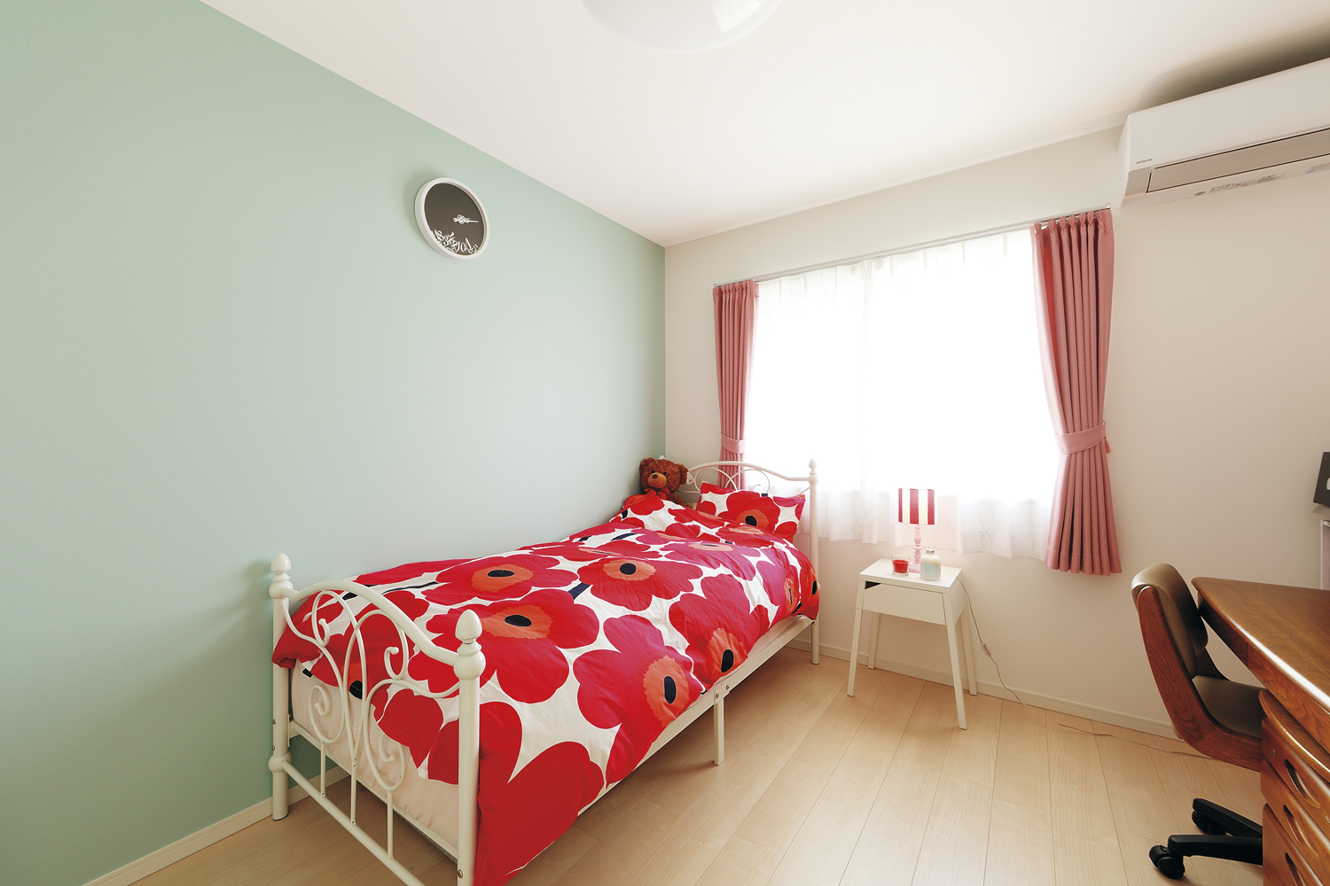 南東に海の見える絶好の借景を最大限に活かす為、2階にLDKと水廻りをプランニングし、どこにいても海が眺められるプラン計画をご提案。打合せ内にも細やかなアイディアが飛び出し、ご家族にとって馴染みのある土地にオンリーワンの邸宅が完成しました。奥様が一目惚れしたというフロートタイプの赤いキッチンや赤い外壁も、他の部分の主張を抑えた色彩計画により、上品かつキュートに仕上がり、周囲になじみながらも圧倒的な存在感を放ちます。