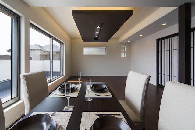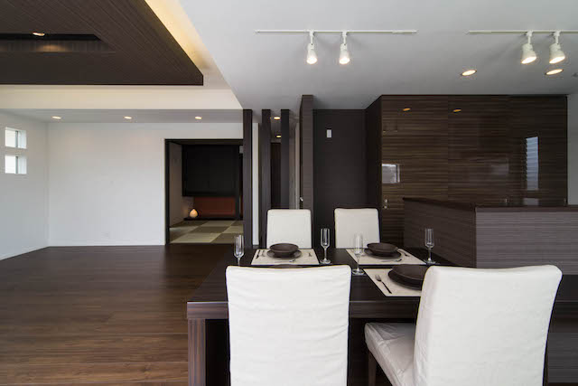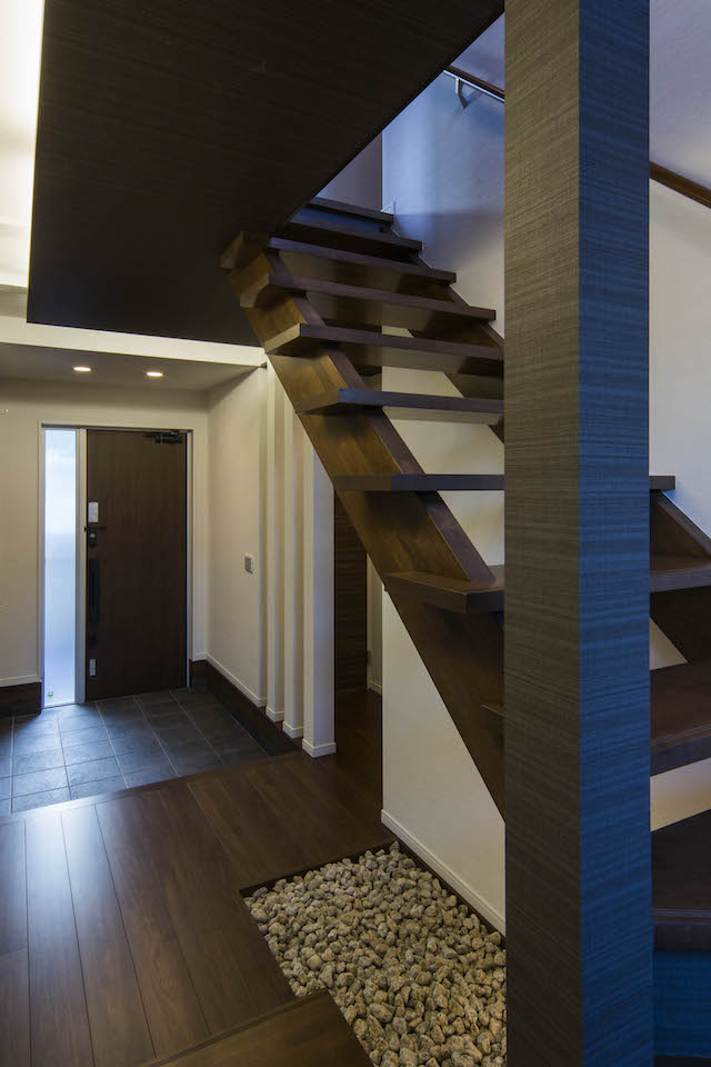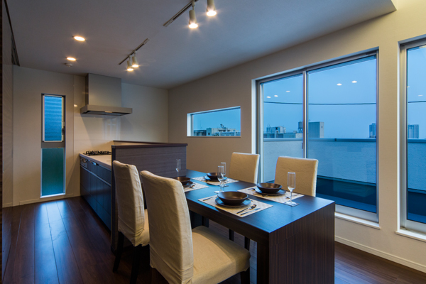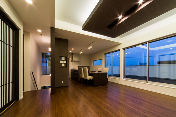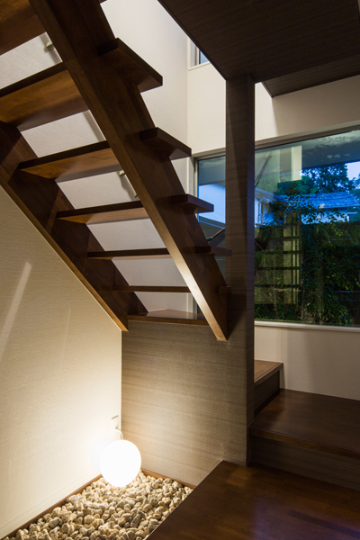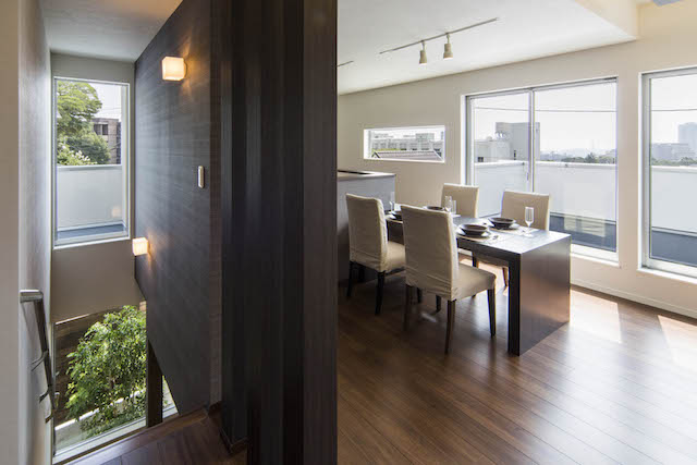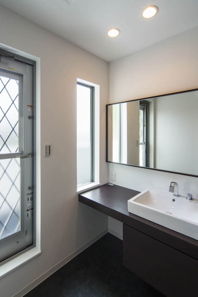 高台の絶好のロケーションを活かし、2階を生活の中心としてプランニング。LDKのどこにいても視界の先に明るい空が広がります。LDKと共に洗面所、浴室も2階に上げることで1階の各居室や玄関まわりは十分な広さをもち、大きめのSICも確保。また、2階の洗面室もバルコニーを隣接させることで理想的な家事動線を実現。建築士との綿密な打合せにより、居心地を最優先させながらもスタイリッシュな邸宅に。