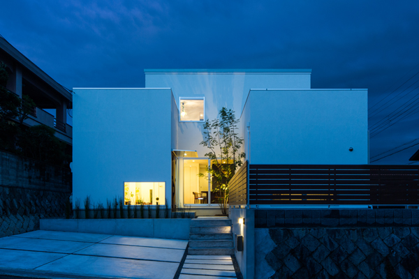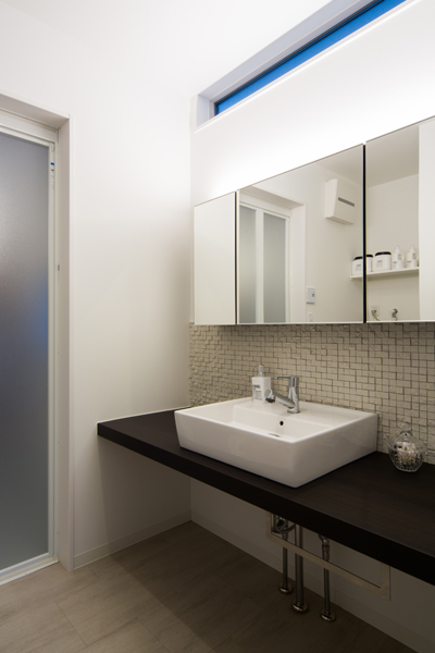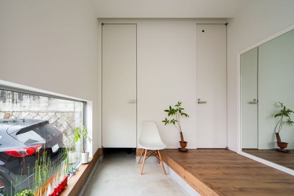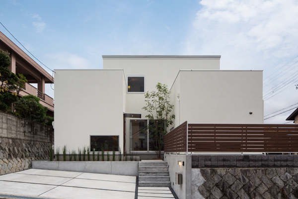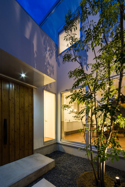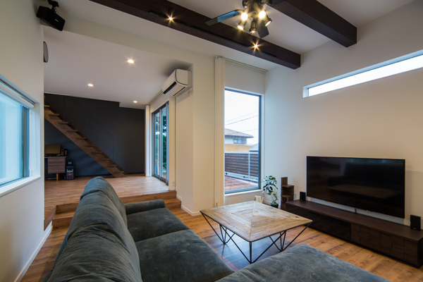 LDKからの広がりや坪庭の広がりを体感できるよう視線の抜けを大切にプランニング。空間のアクセントが欲しいとのご要望に対しリビングを300mmダウン、天井の構造材を現し、リビングとダイニングキッチンの差別化を図りました。各部屋を"箱の集合体"として機能させるために坪庭やデッキ空間を上手に利用した都市型コートヤードのある住まいです。