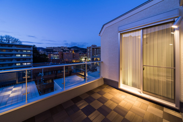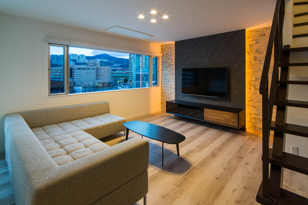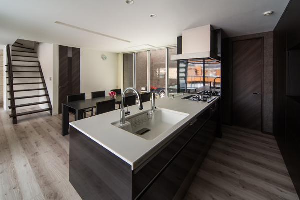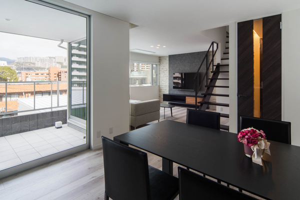 川を望む高台という圧倒的な景色の良さを活かし、リビング・ダイニング・キッチンのどこにいても広い青空を見晴らすことができるようにプランニング。家具や照明もトータルにプロデュースされた空間はモデルハウスのような美しさを放つ。