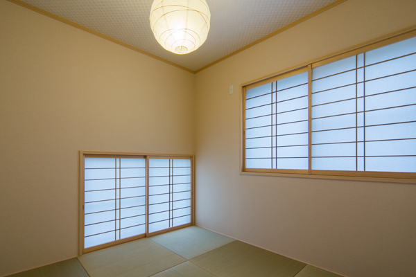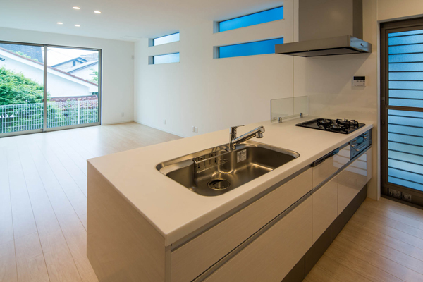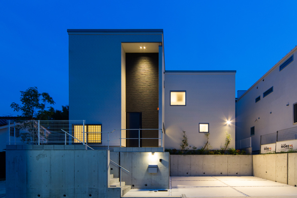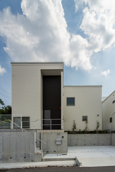 広い間口を生かしたファサードが印象的な邸宅。計算された間口の配置により、視線を遮りながら室内は光にあふれています。外部共にシンプルに、飽きのこない意匠でまとめられています。