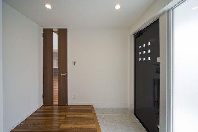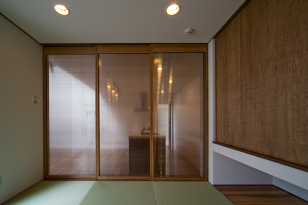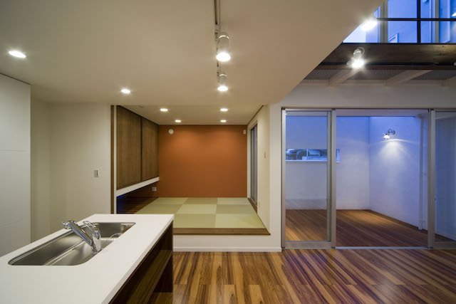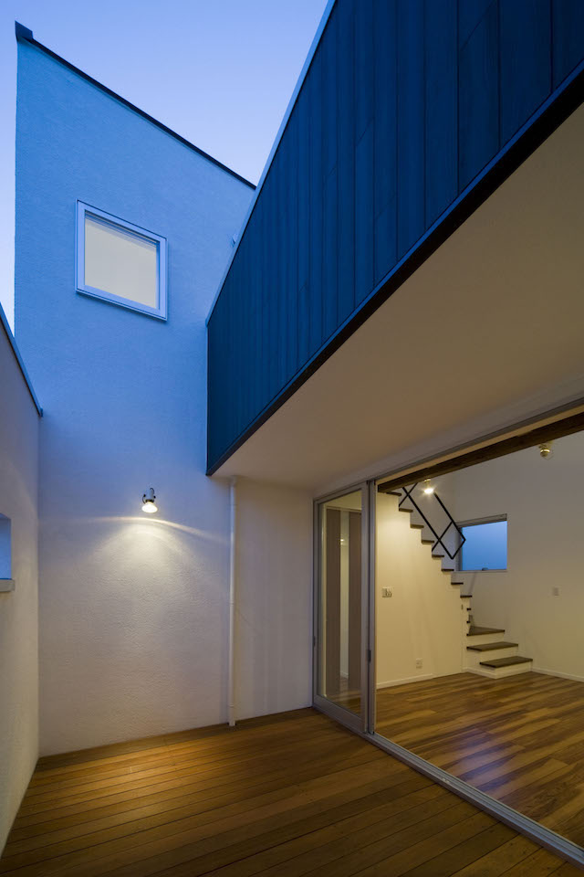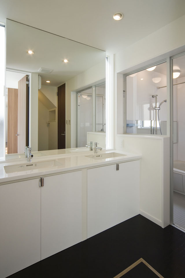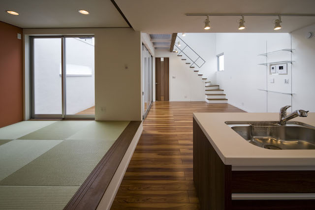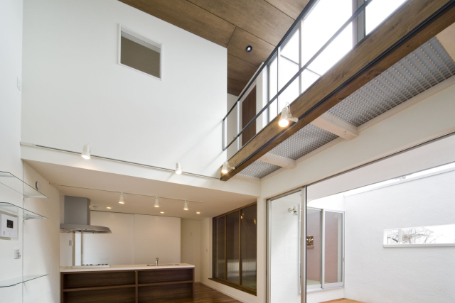 旗竿状の土地でのプランニング。周り四方に家が建つことが予想されるため、採光を確保すべく中庭を配置し、光と空間の抜けを実現させました。中庭はあえて四方を壁で覆い、上部から光を採り入れながらもプライバシーも守ります。この抜け感を2階の通路にも利用することで、吹抜としての一体感を持たせています。